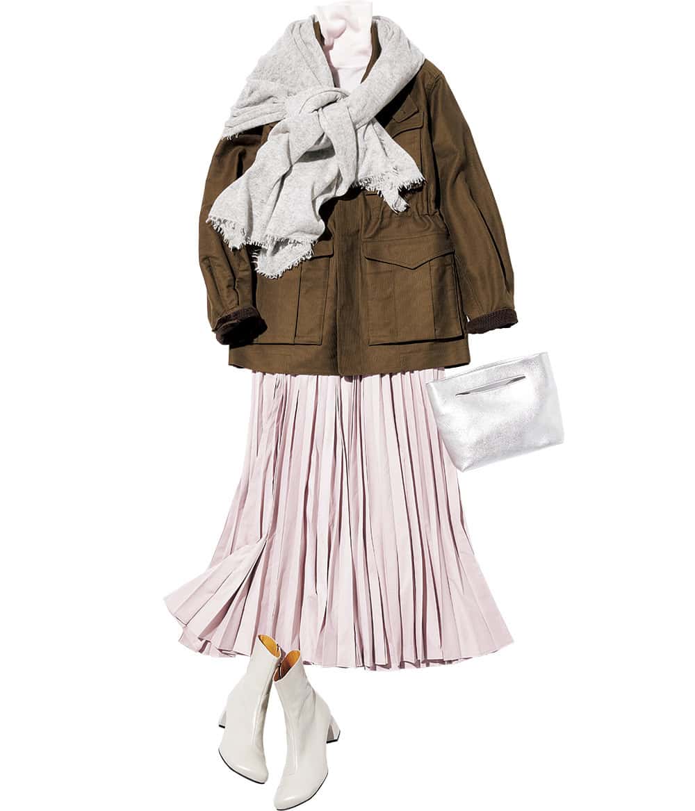 ミリタリージャケット¥89,100(カオス/カオス丸の内)ニット¥26,400(エイトン/エイトン青山)スカート¥27,940(23区/オンワード樫山)ストール¥60,500(アルポ/アマン)バッグ¥64,900(MIUUR/ショールーム セッション)ブーツ¥80,300(カチム)