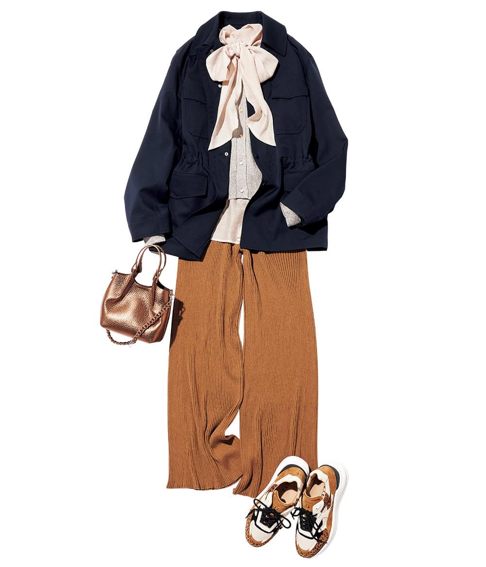 ミリタリージャケット¥77,000(ロエフ/エイチ ビューティ&ユース)カーディガン¥31,900(ebure/リトルリーグ インク)ボウタイブラウス¥25,300(ウィム ガゼット/ウィム ガゼット 玉川髙島屋S・C店)パンツ¥55,000(ハイク/ボウルズ)バッグ¥40,700ストラップ¥9,900(ともにジャンニ キアリーニ/ジャンニ キアリーニ 銀座店)スニーカー¥44,000(デイト/ティースクエア プレスルーム)
