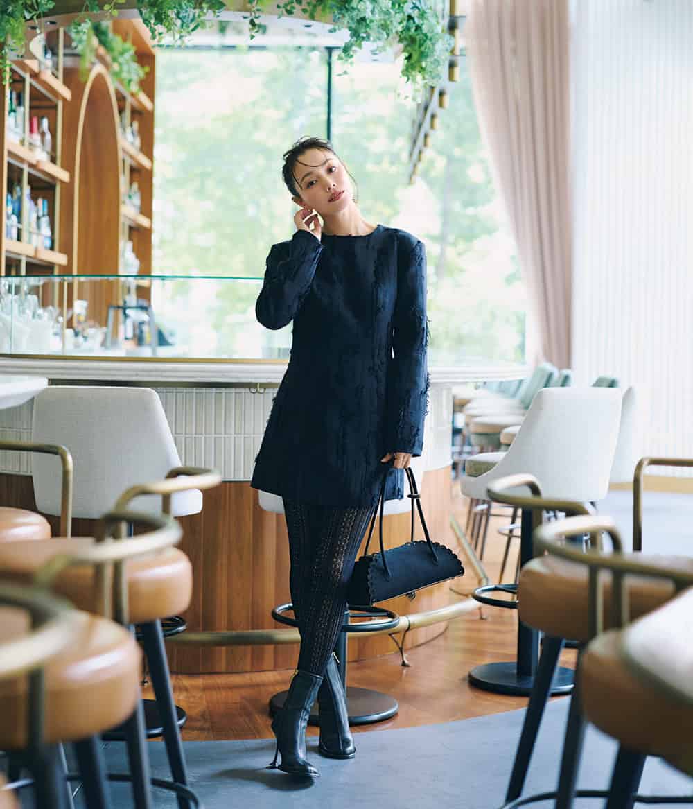 クチュール感のある素材×モダンなシルエットが秀逸。ほんのり揺れるデザインが柔らかさを演出。ワンピース¥60,500(デパリエ/デパリエ 伊勢丹新宿店)ジャケット¥75,900(エブール/リトルリーグ インク)バッグ¥165,000[参考価格](ネオス/ザ・ウォール ショールーム)パンプス¥130,900(セルジオ ロッシ/セルジオ ロッシ ジャパン カスタマーサービス)ピアス¥121,000イヤーカフ¥172,700(ともにプライマル)タイツ(スタイリスト私物)