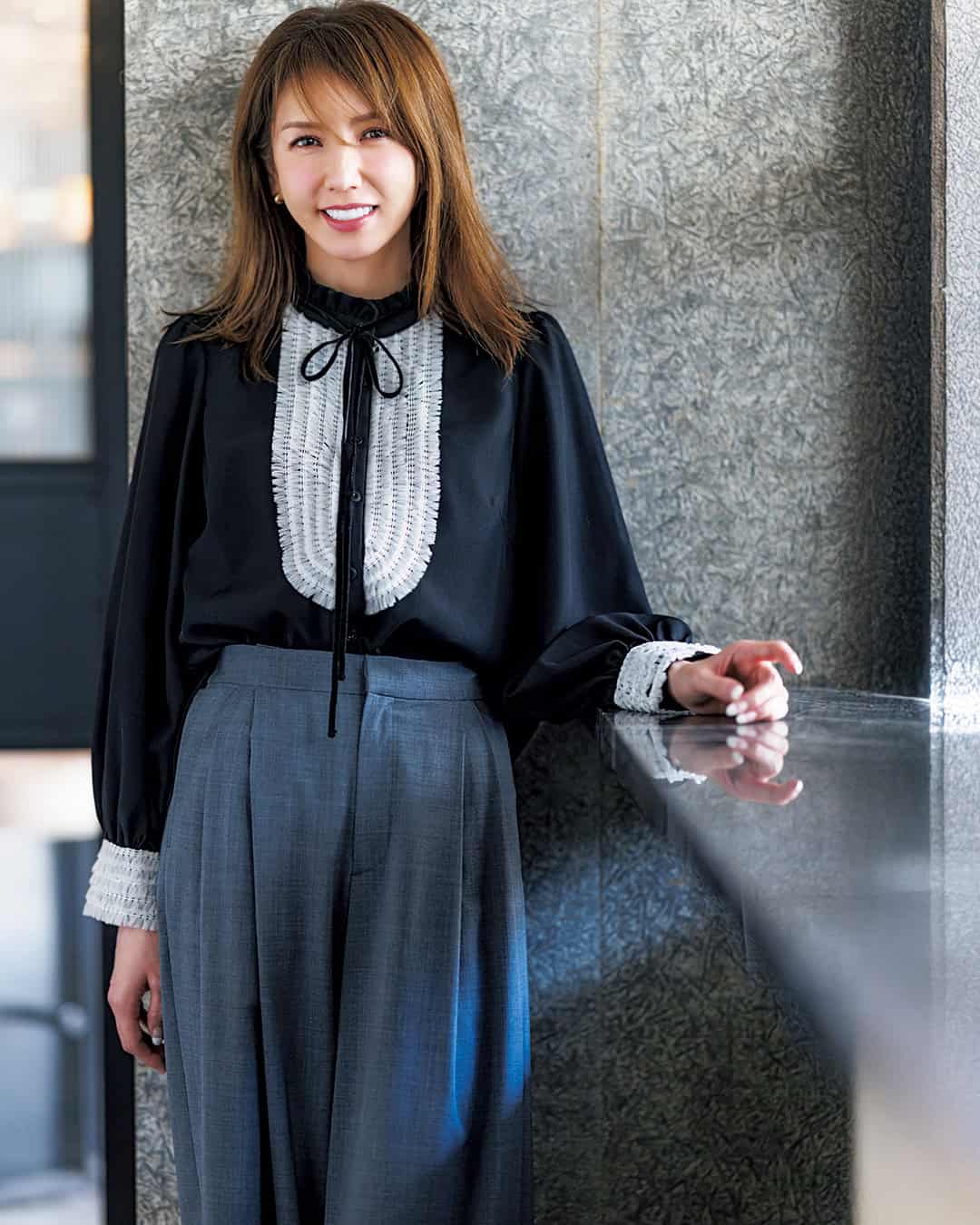 ➀「ドレスアップパンツ」でモノトーンでも華やかに!