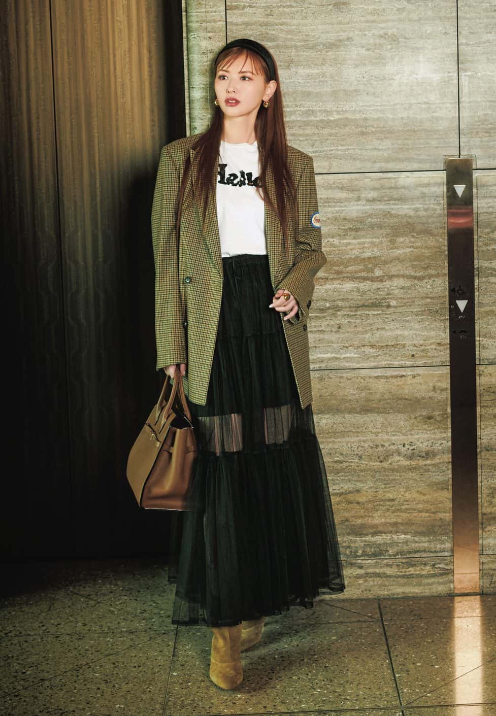 チェック柄ジャケット¥170,500 Tシャツ¥64,900(ともにマディソンブルー)チュールスカート¥28,000(シーニュ)バッグ¥781,000(ヴァレクストラ/ヴァレクストラ ジャパン)ブーツ¥48,400(ヨシト/ニューロンドン)カチューシャ¥14,300(ジェニファー オーレット/RHC ロンハーマン)ピアス¥8,690〈ピルグリム〉リング ¥34,980〈ともにソコ〉(すべてZUTTOHO{hlb}LIC)