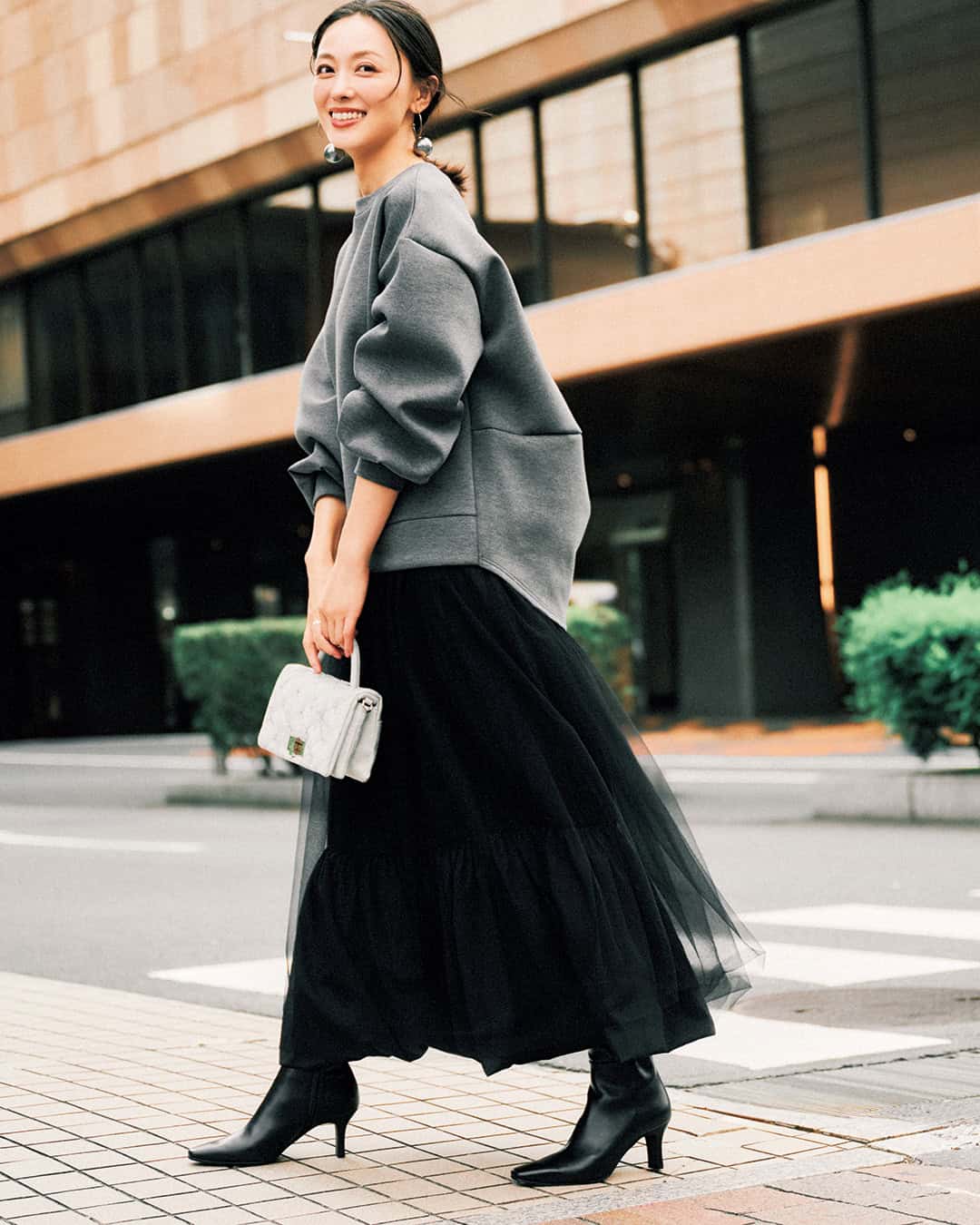 ➀華奢見えする「盛りスウェット」はチュールスカート合わせでお出かけ仕様に