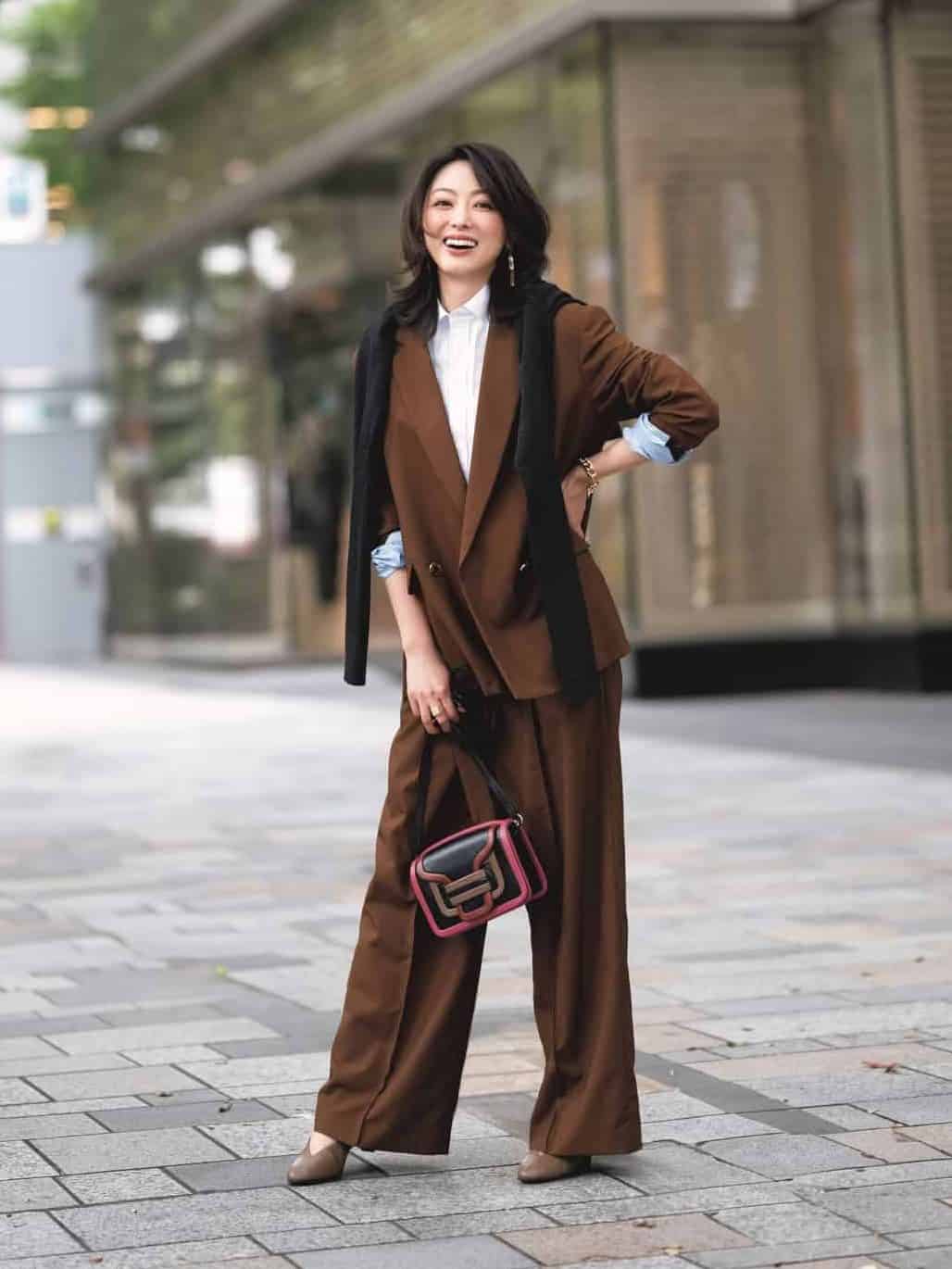 今季注目の赤みブラウンが主役のジャケットセットアップ。深みのあるカラーが冬の装いに華やぎをもたらし、ジャケット×パンツの組み合わせで着回し力も期待できます。合わせるインナー次第で、きちんと感もカジュアルも自在に楽しめるのも魅力です。