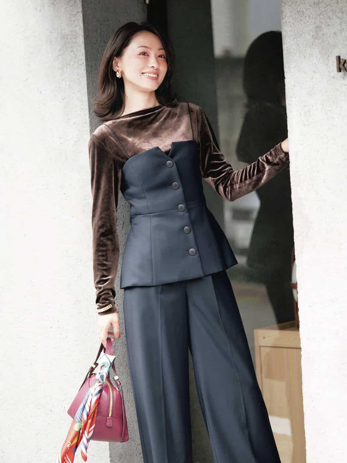 ビスチェとパンツの組み合わせで、いつもの効率重視コーデも一気に見違えた印象に。ブラウンのベロアカットソーを重ねれば、柔らかな光沢が上品さをプラス。甘すぎず大人っぽく、きれいめ見えが叶うセットアップです。