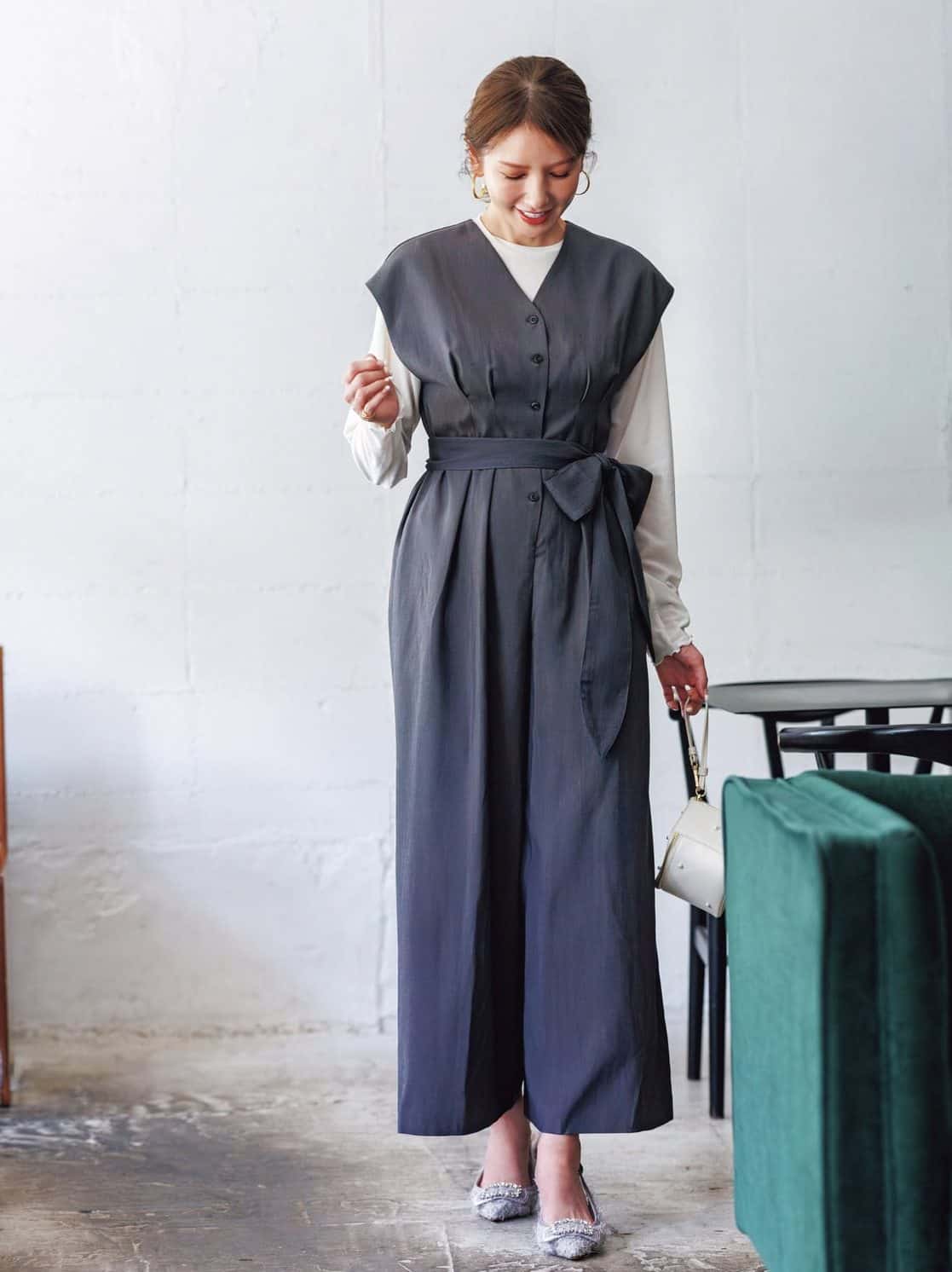 一枚で甘さと端正さを両立できるグレーのオールインワン。インナーを仕込んでも一枚で着てもバランス良く決まる美シルエットが魅力です。ウエストをリボンでキュッと締めれば脚長効果が生まれ、大人の可愛げをスマートに演出。