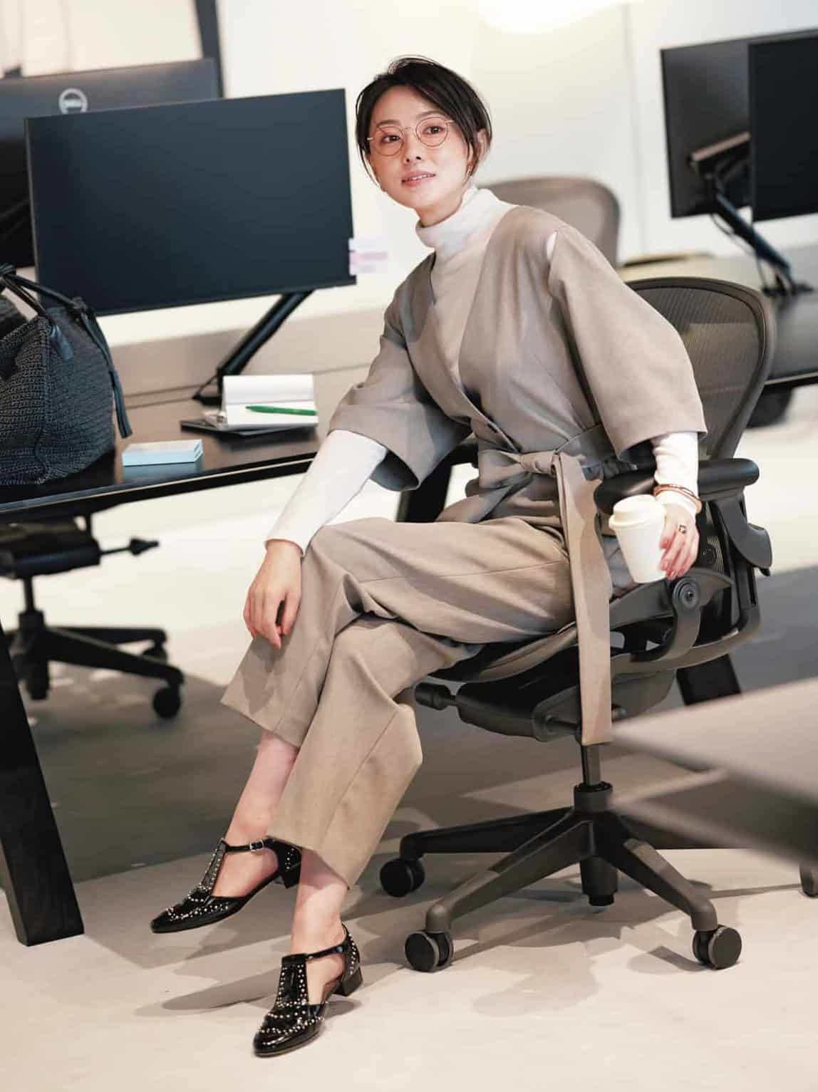 ジャケット¥139,700パンツ〈ベルト付き〉¥52,800(ともにマッキントッシュ/マッキントッシュ 六本木ヒルズ店)シャツ¥70,400(セブリン/アマン)肩にかけたカーディガン¥25,300(ザ シンゾーン/シンゾーン 表参道本店)バッグ¥157,300 パンプス¥155,100(ともにピエール アルディ/ピエール アルディ東京)ピアス¥12,100ブレスレット¥12,100リング¥13,200(すべてワンエーアールバイウノアエレ/ウノアエレ ジャパン)