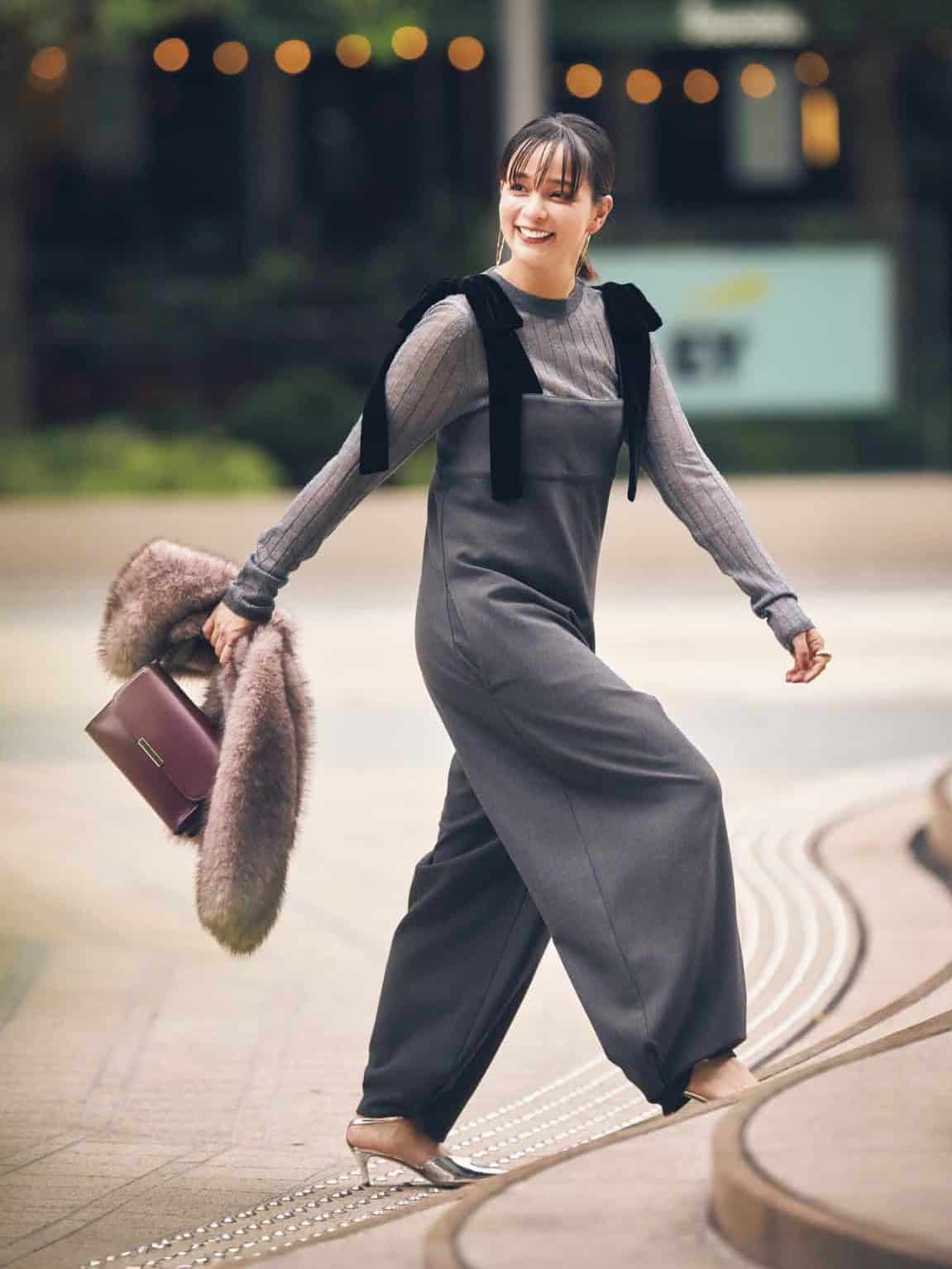 リボンが効いた美スタイル「グレーオールインワン」