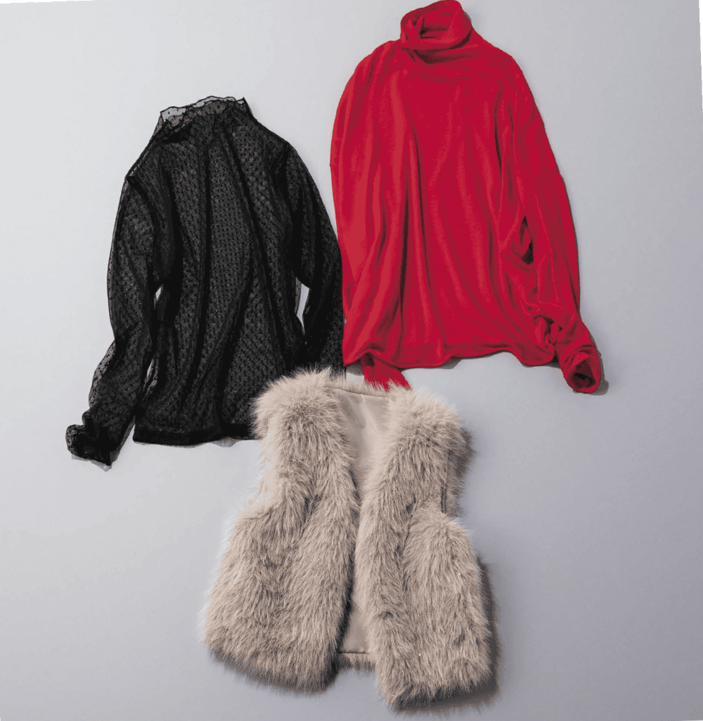 A赤ニットはデニムやタックパンツに合わせるだけで即コーデを更新できる。ニットプルオーバー¥14,300(スローブイエナ) Bシアートップスはこの時期ジャケットやニット、ジレのインナーに最適。トップス¥11,900(AMOMMA)Cほんのり施されたラメが忘年会など冬イベントを一層盛り上げる。ジレ¥9,790(SPANNE)