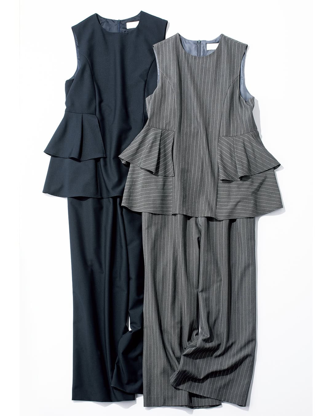 ペプラムデザインはセットアップ見えするので、きちんと感もあり、オケージョンにも便利な1枚。後ろファスナーで着脱がスムーズ。グレーのみストライプ柄でよりマニッシュな印象に。