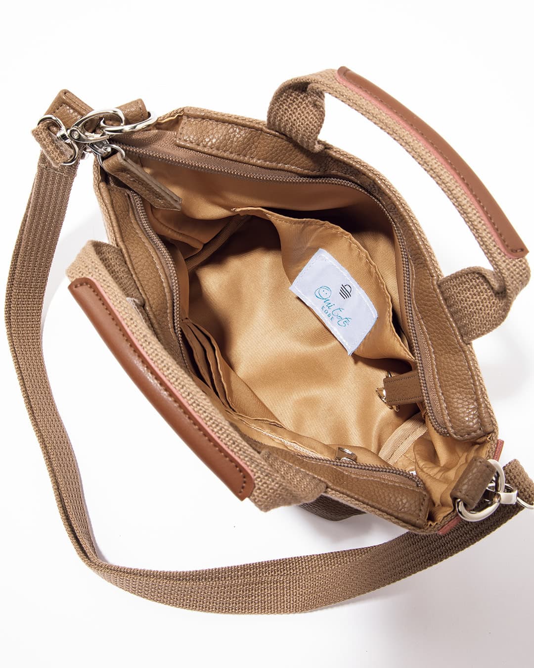 ラージサイズは仕事やオケージョンのサブバッグとして、ミニサイズはメインバッグとして活躍。取手にはブラックの厚手パイピングがアクセントに。ラージサイズには大きめの内ポケットもあり。