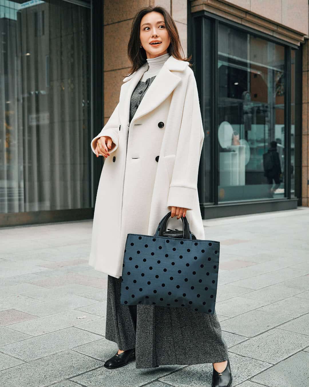 トートバッグ¥14,410(ビビスール)コート¥69,300(ティッカ)ジレジャケット¥19,800パンツ¥24,200(ともにアルページュストーリー/アルページュストーリー プレスルーム)パンプス¥19,800(ル タロン グリーズ/ル タロングリーズ ルミネ新宿店)ピアス¥28,600(プラウ)リング¥13, 200(ワンエーアールバイウノアエレ/ウノアエレ ジャパン)