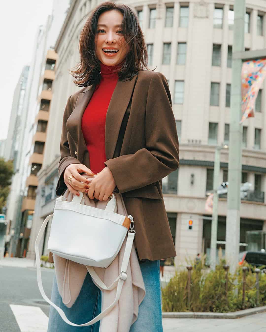バッグ(ミニミニ)¥9,900(ウイトート)ジャケット¥31,900(アルページュストーリー/アルページュストーリー プレスルーム)タートルニット¥22,000(ツル バイ マリコ オイカワ)パンツ¥25,300(ローラス/ジャック・オブ・オール・トレーズ プレスルーム)ストール¥41,800(エストネーション)リング¥13,200〈ワンエーアールバイウノアエレ〉(ウノアエレ ジャパン)