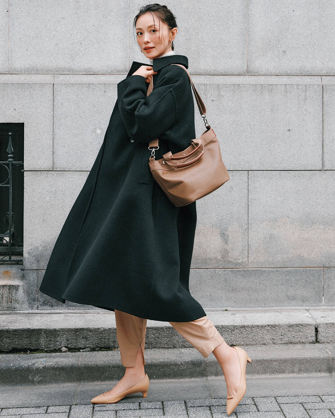 コート¥33,000(モカ)パンツ¥31,900(HER.)バッグ¥10,780(バーセルフ)ピアス¥9,800〈マイアメイドストア〉イヤーカフ¥14,960〈チロジュエリー〉ネックレス¥12,100〈パールフォーライフ〉(すべてロードス)シャツ/スタイリスト私物