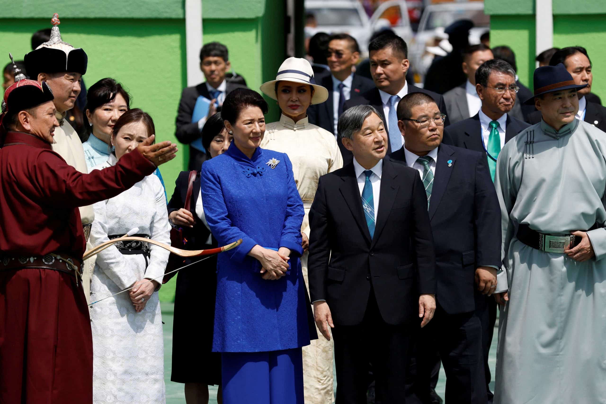 民族衣装をモダンに再解釈したようなロイヤルブルーのセットアップで、モンゴルの民族の祭典「ナーダム」にご出席。モンゴルの高山植物として広く自生しているエーデルワイスに似た、モンゴルウスユキソウ、別名ムンフツェツェグ(永遠の花)を想わせるブローチで、胸元に華やぎを添えています。「モンゴルの初代皇帝、チンギス・ハーンの生涯を描いたベストセラー小説『蒼き狼』から着想を得てロイヤルブルーを選ばれたのかもしれません。ジャケットのデザインはモンゴルの民族衣装風ですが、組紐をあしらったボタンは和もイメージでき、訪れた国に敬意を表しながら日本の文化も見てとれ、両国の友好の絆を感じさせる、雅子さまの想いが表れた装いです(つげさん)」。