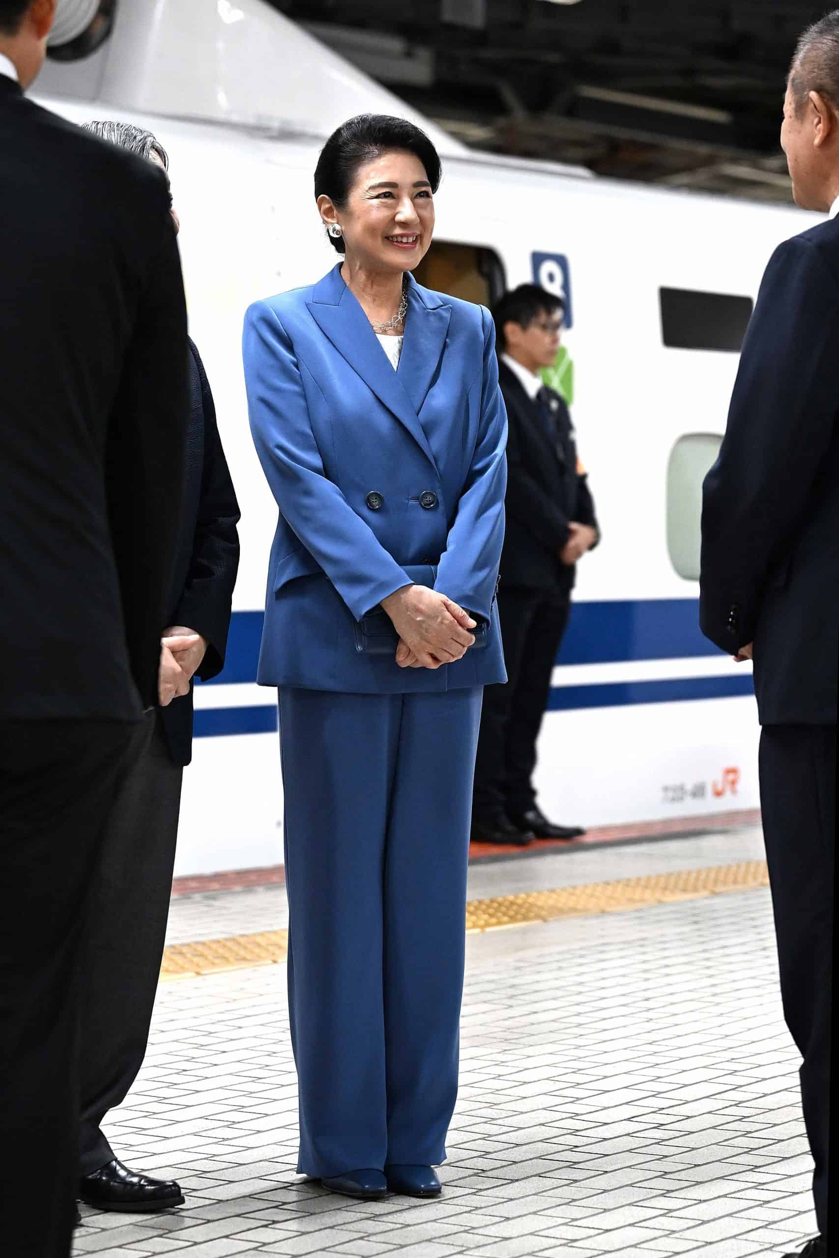 「国民スポーツ大会」のスーツと色は共通しながらも、トレンド感のあるペプラムシルエットのジャケット、センタープレスのテーパードパンツと、またもや新鮮なイメージで周囲を魅了されていた雅子さま。色で想いを表現されることが多い分、登場する回数の多い色が毎回同じ印象にならないように、服のラインやあしらいなどでイメージを変化させる着こなしには、細やかな気遣いが感じられます。また、大粒のパールのイヤリング、ステーションネックレスが、ミャクミャクの目のようでキャッチーなポイントにも。「万博のイメージカラーは、公式キャラクター“ミャクミャク”に使用されている赤、青、白。赤は生命の象徴である細胞を表し、青は自由自在に形を変える清い水を表しているそう。そのイメージカラーの中から、雅子さまとなじみの深いブルーを選ばれたのかもしれません。当時は『ミャクミャクカラーでお出ましになった』と話題にもなっていました。まだ暑かった10月。白のインナーとブルーの配色が涼やかで、印象的です(つげさん)」。