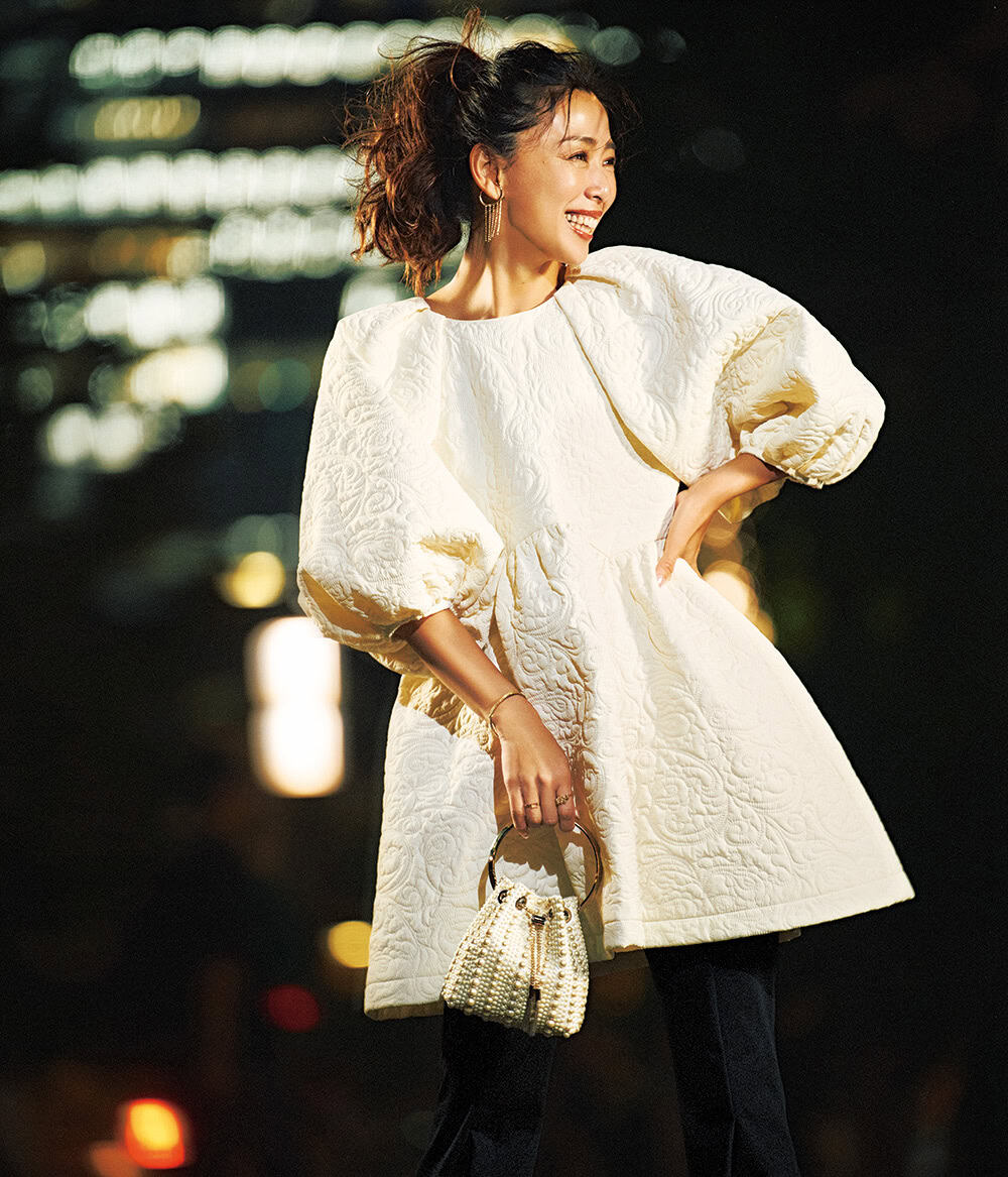 ブラウス¥29,700(HER.)パンツ¥22,000(LE PHIL/LE PHIL NEWoMan 新宿店)バッグ¥360,800(ジミー チュウ)リング[右手人さし指・数量限定]¥24,200(ete)バングル¥12,540(チビ・ジュエルズ/チビジュエルズ・ジャパン)リング[右手薬指]¥66,000(KEIR./ロードス)