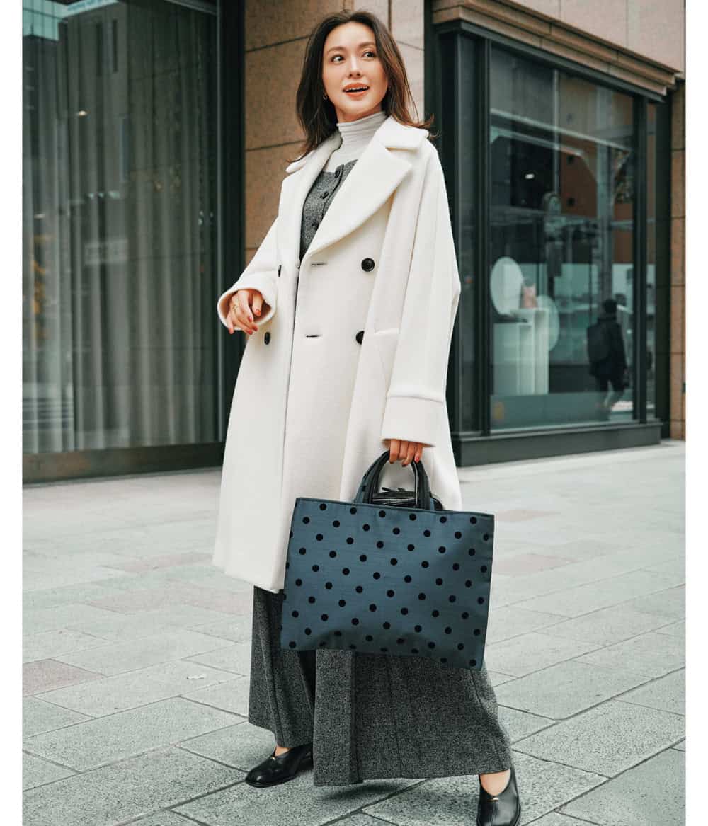 ジレセットアップに冬の街に映える白のコートを羽織って通勤コーデをブラッシュアップ。シャンタン生地×ベルベットのドット柄バッグが控えめながら上品な可愛さを添えてくれます。ガジェットや資料など何かと荷物が増えがちなお仕事や学校行事のサブバッグにぴったり。