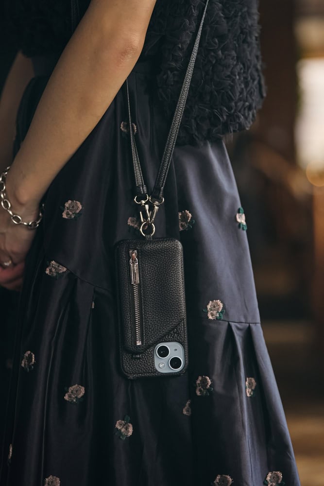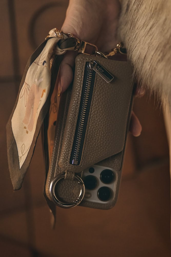 今年っぽくどんなファッションにも馴染むブラウンカラーをセレクト。チャック付きのポケットにはリップや小銭なども収納可能です。ポケット裏のスナップボタンを外すと携帯が自立するので、ZOOMでの打ち合わせやお友達と写真を撮るときなどとても便利!