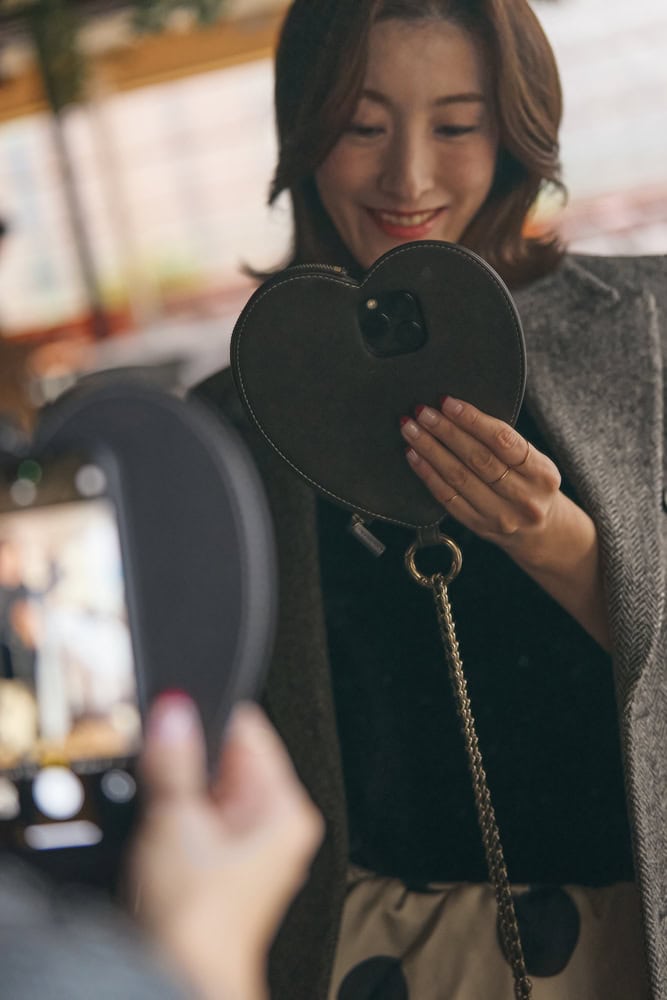 大きくてキャッチーなハートのデザインが唯一無二。持っていると必ず声を掛けられるカンバセーションピース的存在です。展示会などで鏡越しの自撮りをする時にハートが映えるのが嬉しい!チャックも付いていてカードが収納できる機能性の高さも秀逸。