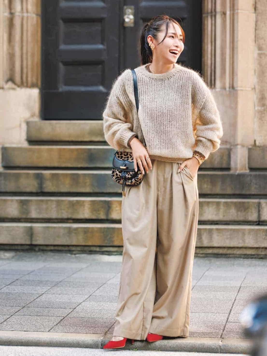冬になるとつい落ち着いた色に手が伸びがち。そんな季節こそ、装いに赤のパンプスをひとさじ――それだけで全身がぱっと華やぎ、気分まで明るくしてくれます。ベージュのワントーンに赤とレオパードのスパイスを効かせれば、いつものカジュアルも一気に都会的に。程よく主張する小物使いが、冬のお出かけを特別にしてくれるスタイリングです。