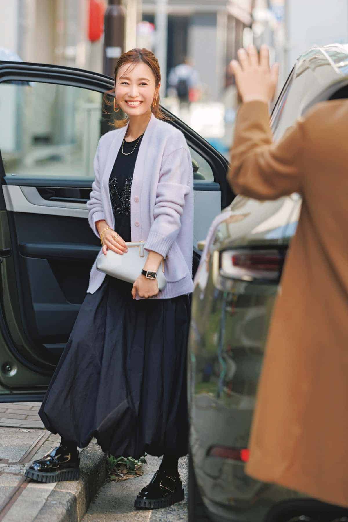 ダークトーンのワントーンに、パープルのカーディガンとクラッチバッグを投入して女性らしさをほんのりプラス。立体的なバルーンスカートは、軽やかさと華やぎを両立する主役アイテム。色をリンクさせたパープルを合わせることで、大人の余裕を感じるエレガントなスタイルに仕上がります。