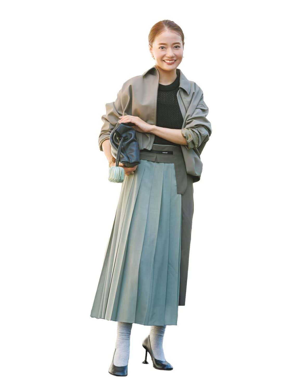 構築的なプリーツスカートが縦ラインを強調してくれるから、スタイルアップ効果も抜群です。軽く羽織ったショートブルゾンで抜けをつくり、メッシュトップスがほんのりモードなスパイスに。ソックス×ヒールの足元は、トレンド感と上品さのちょうどいいバランスを演出。