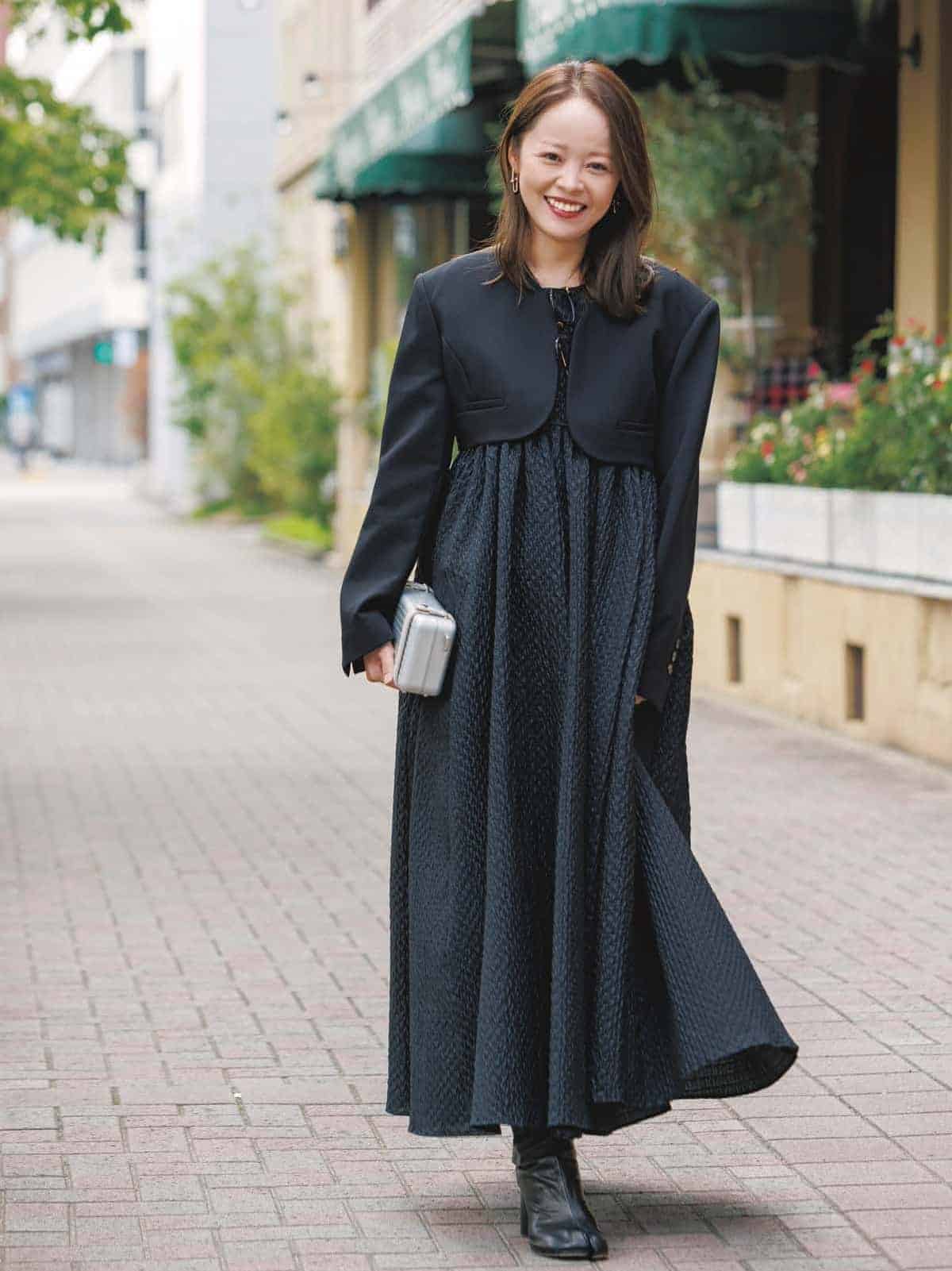 アウターも短め丈ならスッキリ見え抜群できれいめな着こなしができます!ワントーンコーデもフェミニンなロングスカートでより女性らしいシルエットに。黒ワンピもアルミバッグやTabiブーツでモード感を忘れません。