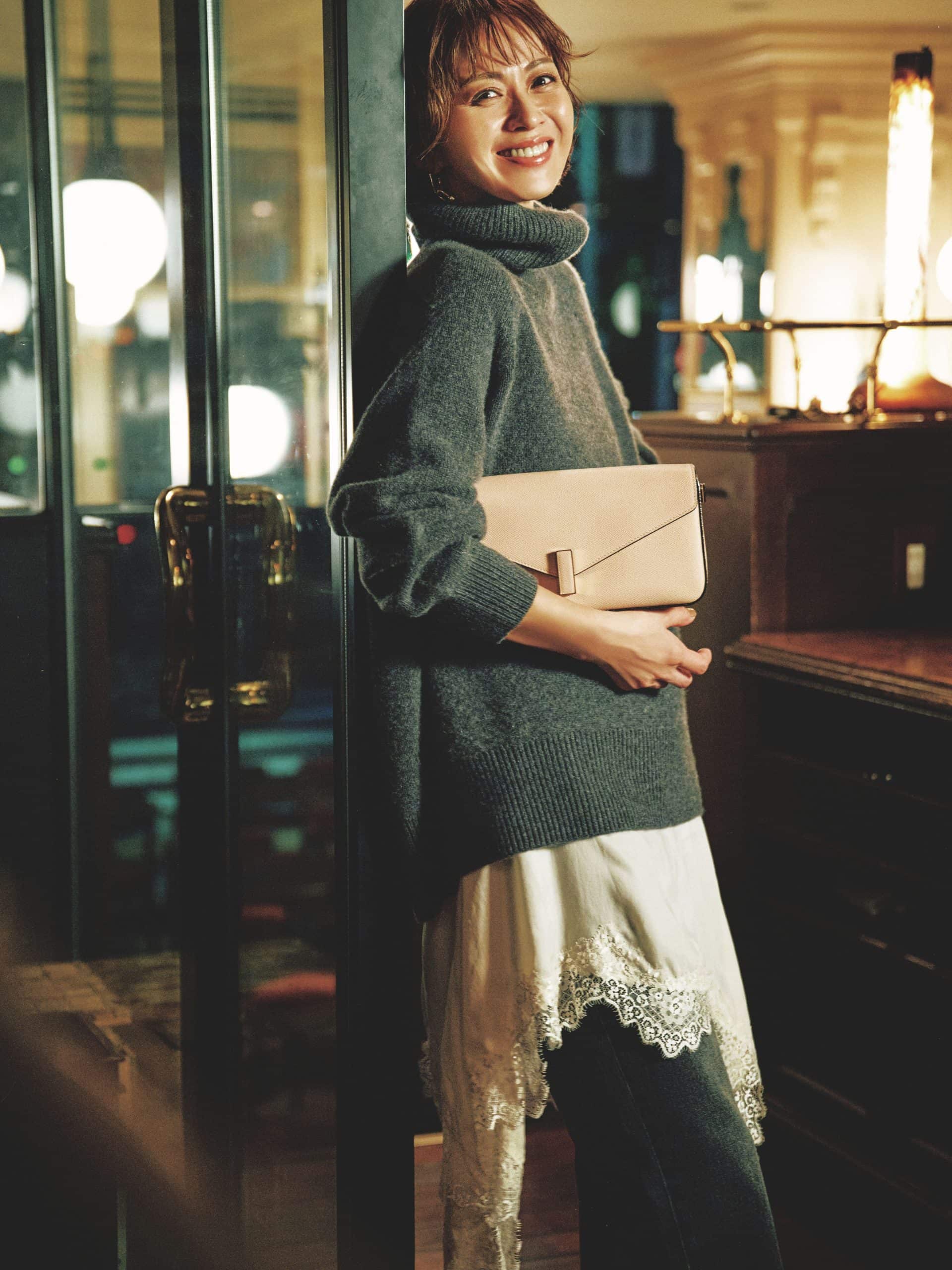 ニット¥46,200(LE PHIL/LE PHIL NEWoMan 新宿店)シャツ¥18,700(emmi/emmi ニュウマン新宿店)パンツ¥26,400(カデュネ)バッグ¥44,000(ヴァジック/ヴァジックジャパン)パンプス¥79,200(ネブローニ)ピアス¥32,560(ソコ/ズットホリック)