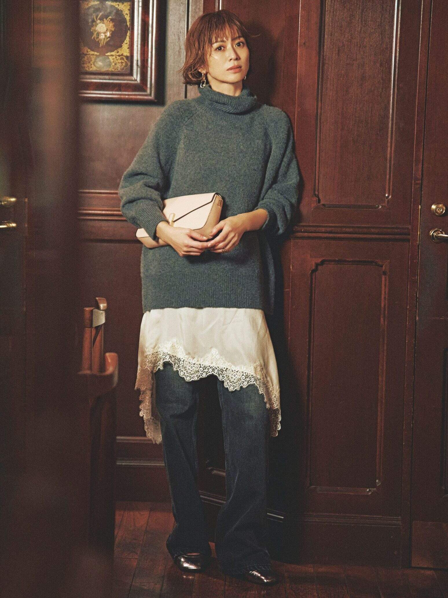 冬は、やはり「ニットが主戦力」という人が多いのでは?そして厚手のニットは重ねたり羽織ったりできず、マンネリしがちな人も多いはず。そんななか、この冬はオシャレな40代に「チラ見せ”」コーデが大流行の兆し!ニットのコーデがぐっとあか抜ける、アイテムとコーデをご紹介します。