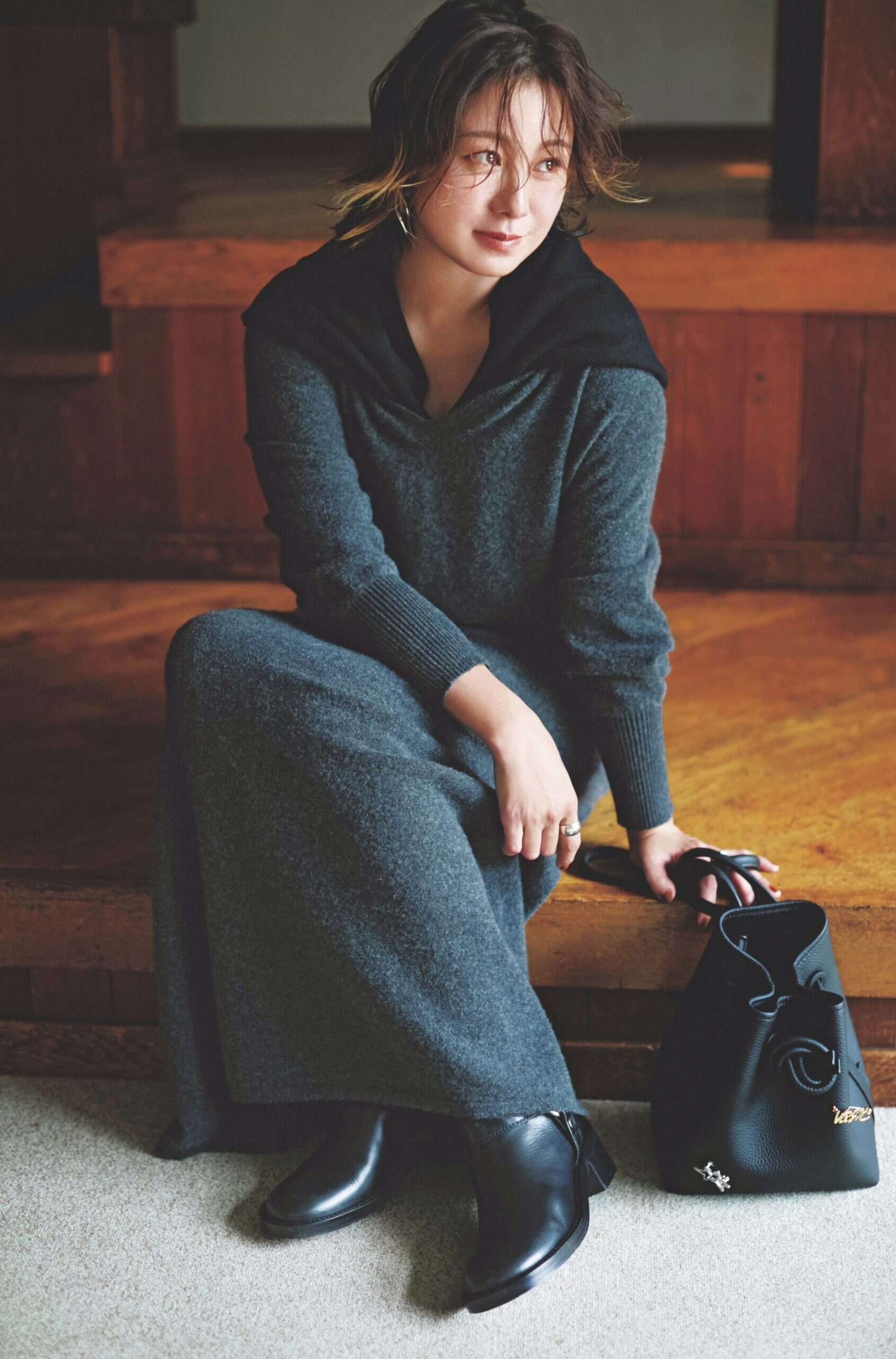 ストール¥14,300(シェアンド/ムーンバット)ワンピース¥49,500(LE PHIL/LE PHIL NEWoMan 新宿店)バッグ¥51,700(ヴァジック/ヴァジックジャパン)ブーツ¥79,200(PIPPICHIC/ベイジュ)ピアス¥30,800(ブランイリス/ブランイリス トーキョー)リング[右手]¥14,740(チビ・ジュエルズ/チビジュエルズ・ジャパン)リング[左手]¥19,470(バルブス/ズットホリック)