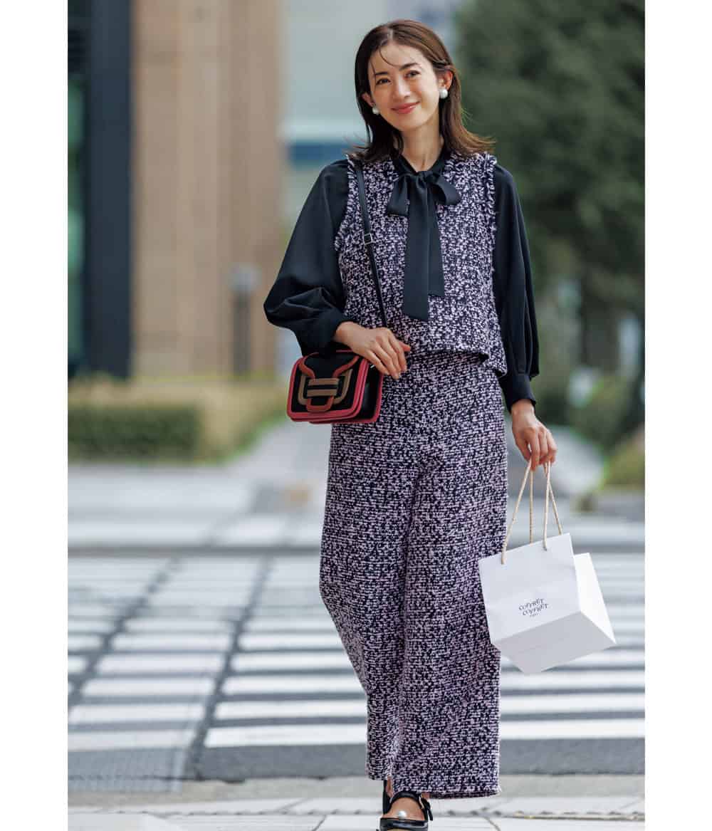 PTAの集まり→学校ママとのお疲れランチ→学校行事のお手伝いとタスク多めな一日。ツイードパンツセットアップならきちんと見え大前提の学校DAYでも華やかさを盛れて、動きやすさまでしっかりキープ。黒地にピンクをきかせた大人可愛いツイードは上品に周りと馴染みつつも、一目置かれること間違いなし。