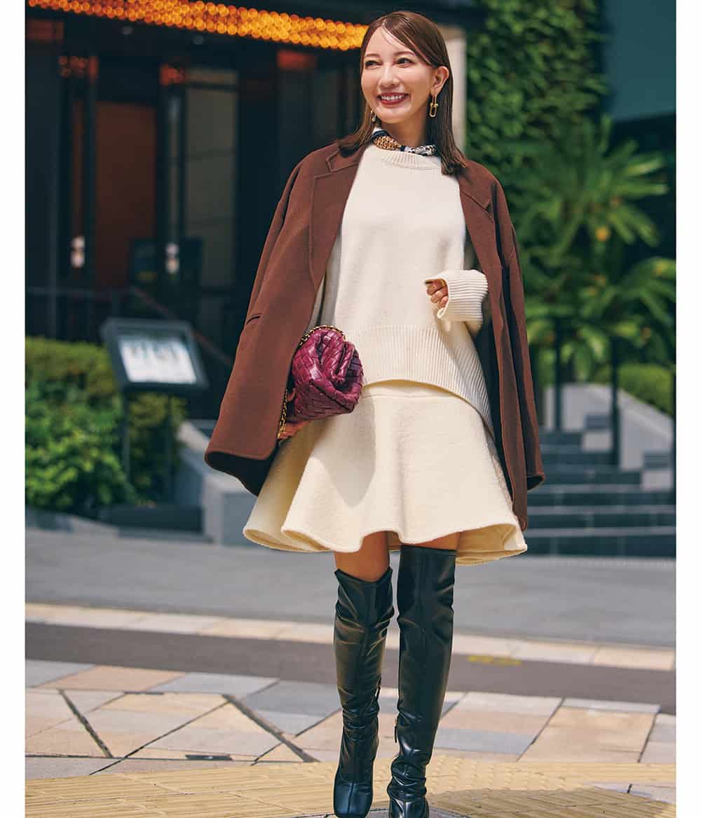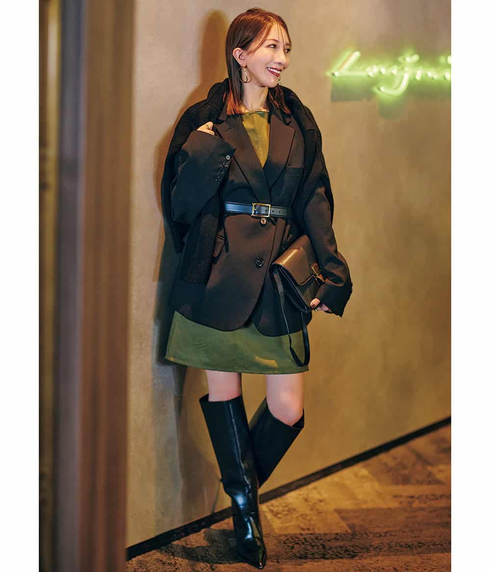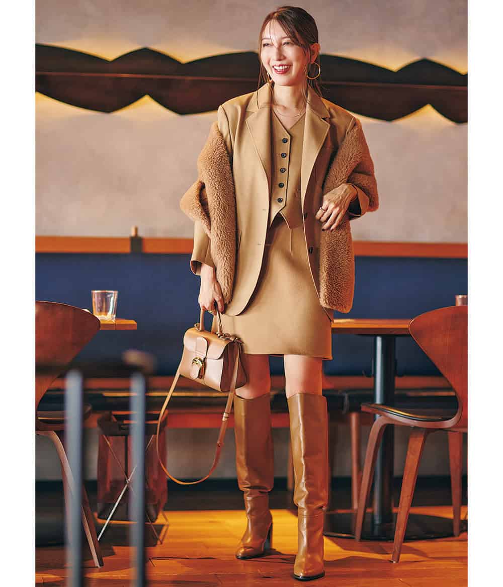 「マニッシュなアウター×ミニスカで少し甘さを加えるバランス感がポイントです。40代ミニスカは敬遠しがちですが、ブーツやタイツを味方にすれば思い切れるので挑戦するなら絶対冬がオススメです」