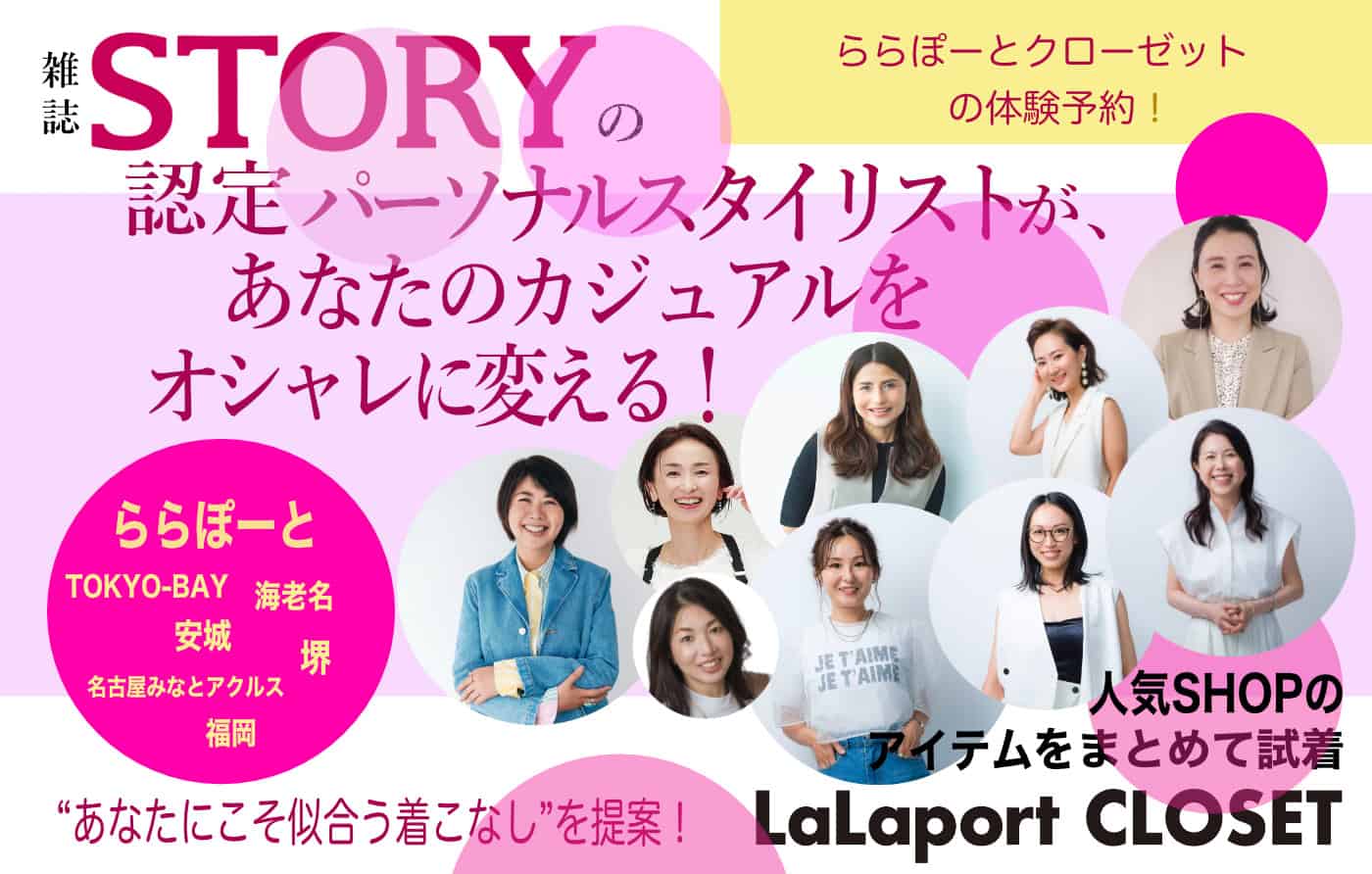 「STORYが街に出る!」をコンセプトにスタイリングサービスを行うイベントです。誌面でも活躍中のSTORY認定パーソナルスタイリストたちが、あなたの体型や雰囲気に合う服を探しながら、トレンドの着こなしをアドバイスします。会場はららぽーと内のさまざまなブランドの中から選りすぐりの旬を集めたセレクトショップ「LaLaport CLOSET」。気にいった服は、その場でららぽーとのECサイト〈&mall〉から購入できるので、手ぶらでSHOPPINGが楽しめます。