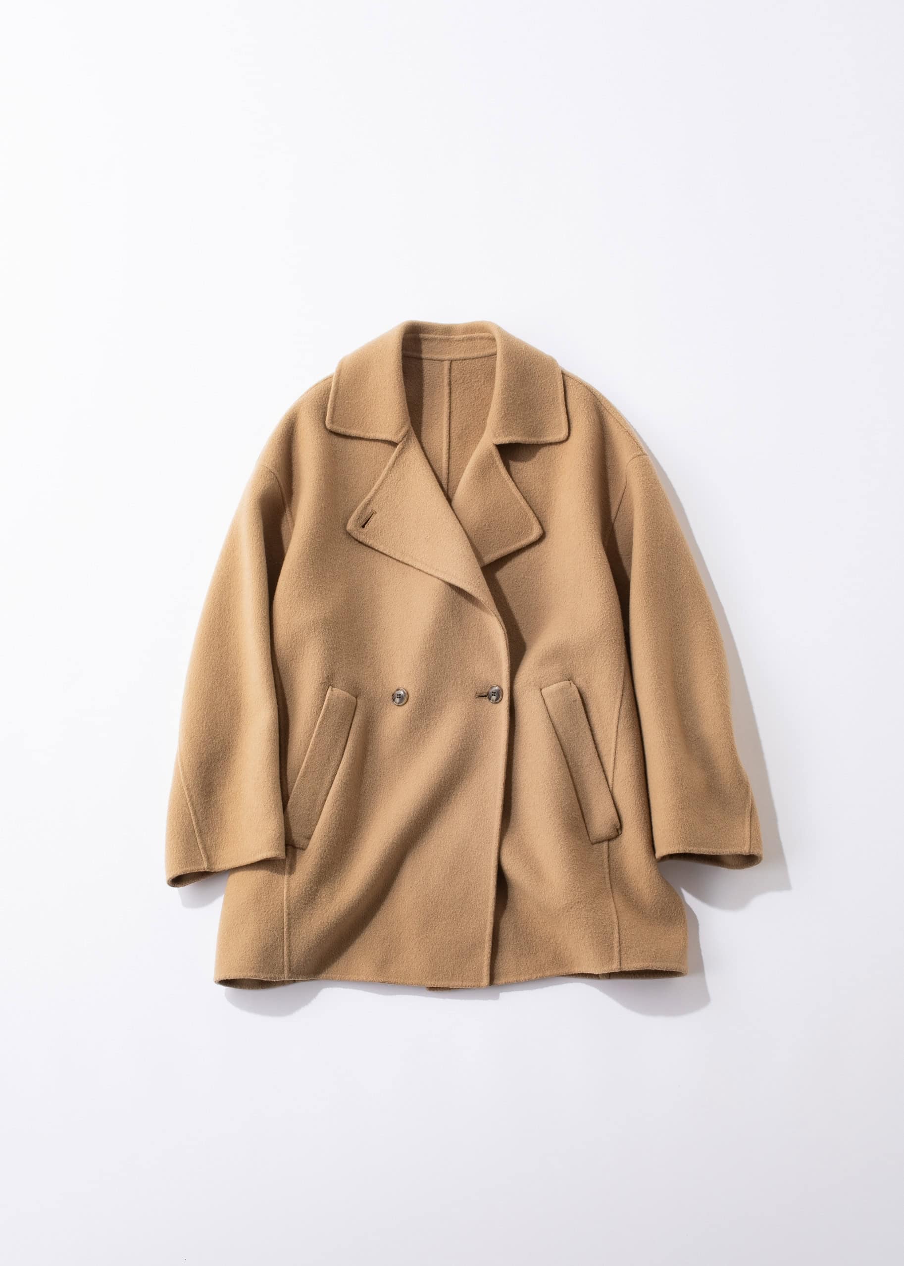 大きな襟が印象的なPコートベースのデザイン。ミドル丈でボトムスを選ばず、きれいめカジュアルからラフなカジュアルスタイルまで幅広く活躍できます。軽やかさと保温性を両立しつつ、程よい厚みで冬の着こなしに抜群の存在感をプラスします。
