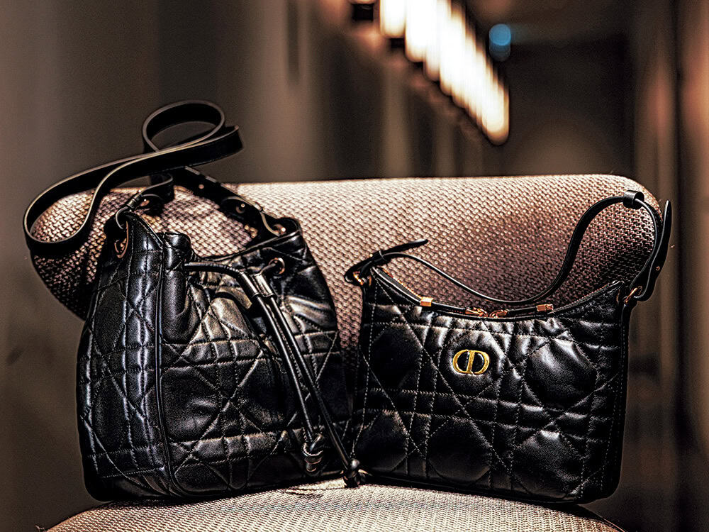 しなやかなブラックラムスキンにマクロカナージュ ステッチを施した「DIOR CARO」はタイムレスなデザインが人気です。「D-MOTION」はより実用的なバケットスタイル。(右)バッグ『DIOR CARO』[H17×W21×D7㎝]¥395,000(左)バッグ『D-MOTION』[H19.5×W17×D11㎝]¥570,000(ともにディオール/クリスチャン ディオール)