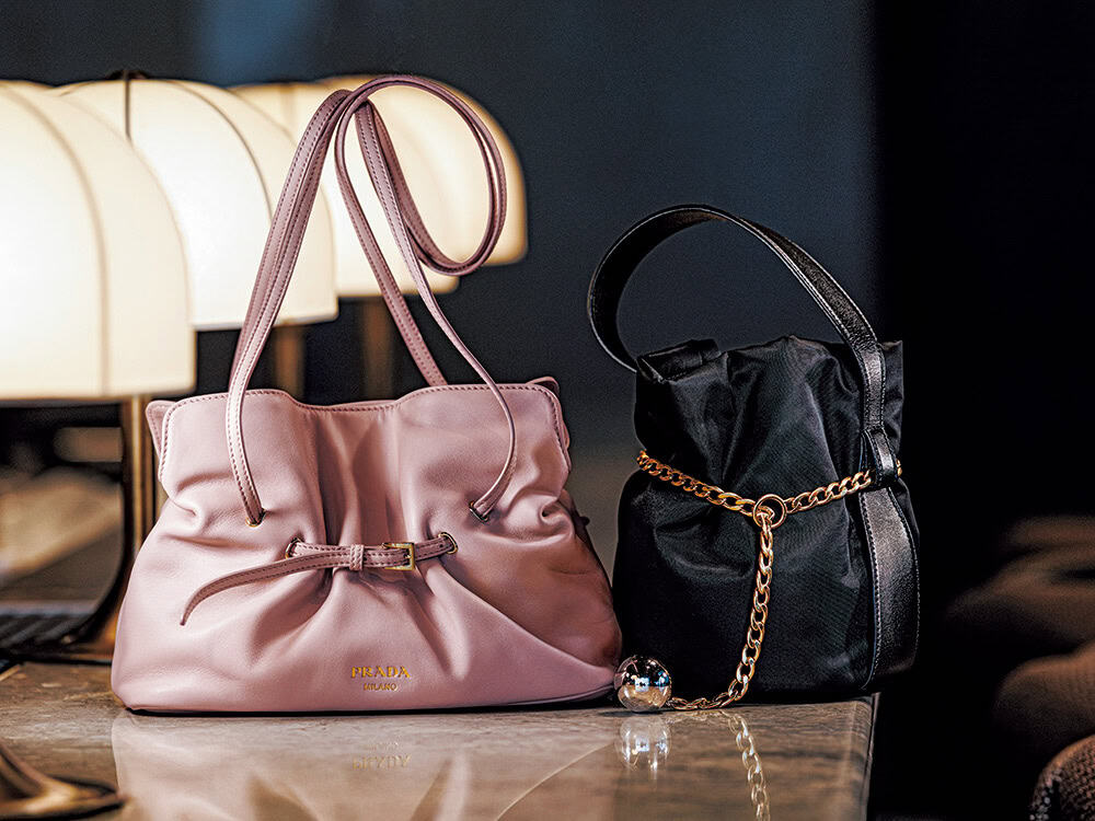 ラムナッパレザーの柔らかさが織りなすギャザーがポイントの「プラダ ダダ」とプラダのアイコニックな素材のRe-Nylon(再生ナイロン)を使った「プラダ プチサック ノワール」は洗練された今っぽさが際立つ。(右)バッグ『プラダ プチサック ノワール』[H19×W15×D6㎝]¥341,000(左)バッグ『プラダ ダダ』[H18.5×W25×D11.5㎝]¥418,000※ともに予定価格(ともにプラダ/プラダ クライアントサービス)