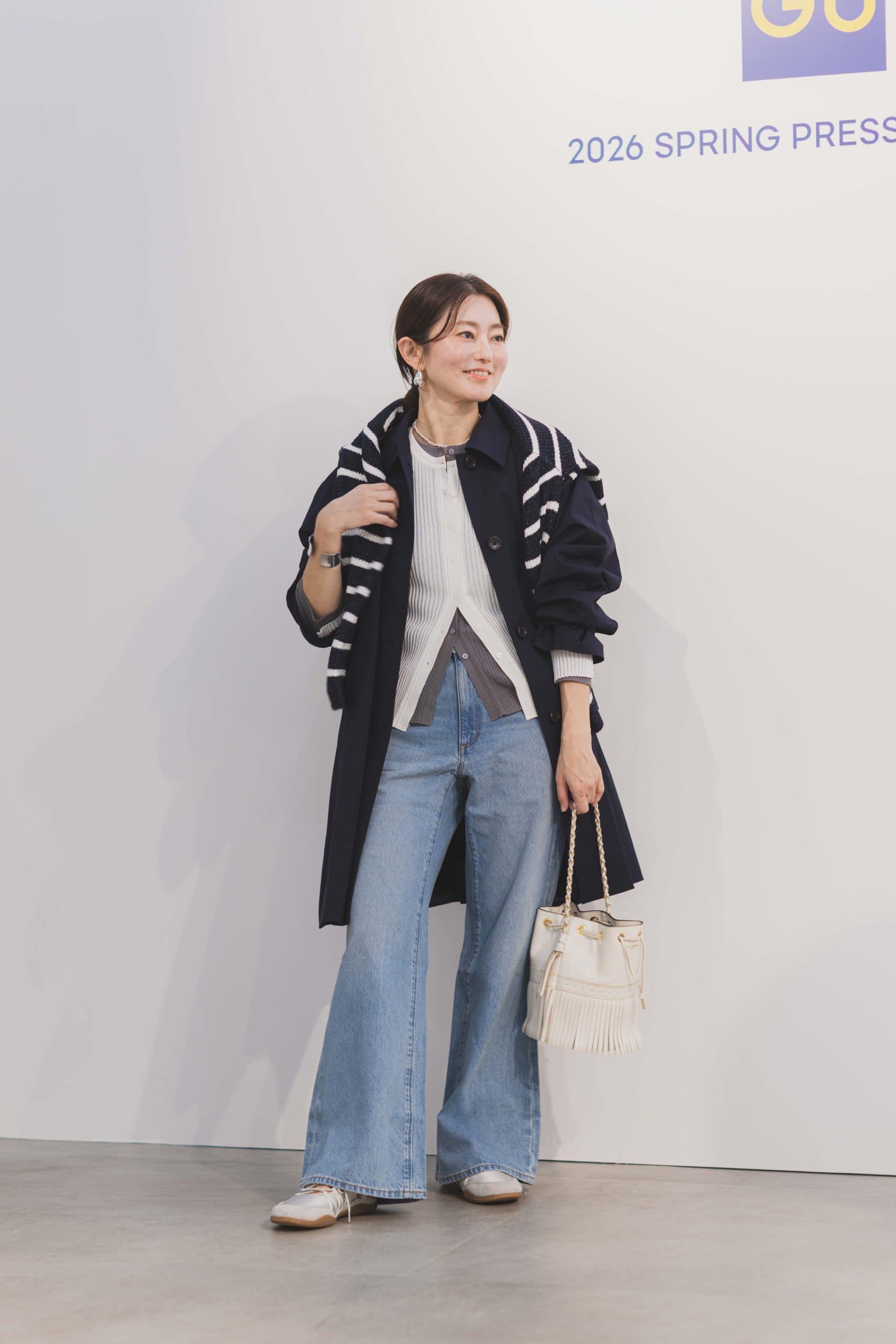 シアーリブカーディガン¥2,490[1月下旬発売予定] ツイーディーニットボーダーカーディガン¥2,990 パルマカーンAラインハーフコート¥5,990[1月中旬発売予定] レースアップバレエスニーカー¥2,990(すべてジーユー)※ニット、アウターはM、パンツはSサイズを着用 バッグ(私物)