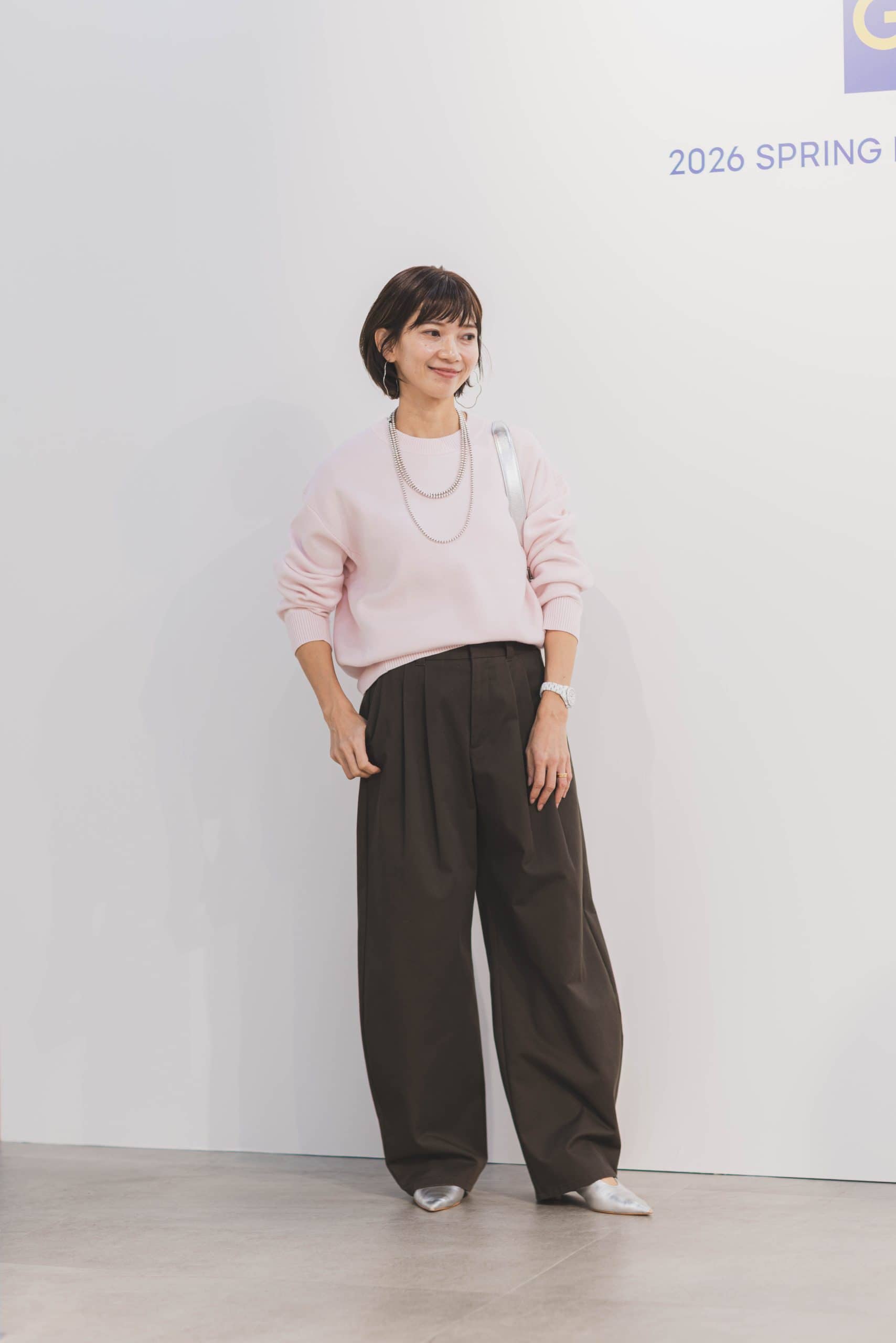 「もっちりとした肌触りが魅力のスウェットライクニットは、程よい厚みがあり気負わず着られるデイリーアイテムです。今回はカーブシルエットが特徴のバレルパンツを合わせて、ピンク×ブラウンの今っぽい配色にしてみました。シンプルなトップスだからこそパンツの立体感が際立ち、こなれ感のあるスタイルが完成します。色やサイズ展開も豊富なので、どんなボトムスとも相性がよく、自分好みのスタイルを楽しめそう。」