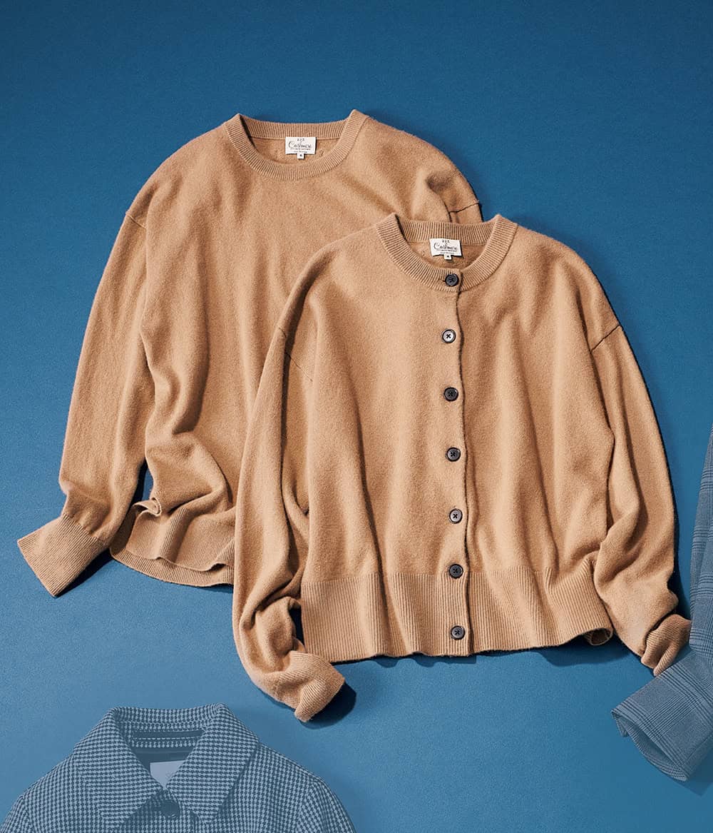 原料から製品化までを管理するカシミヤ専門メーカーで生産された、最高峰のカシミヤ100%。どんなボトムスも高級品に見せる一生もののアンサンブル。