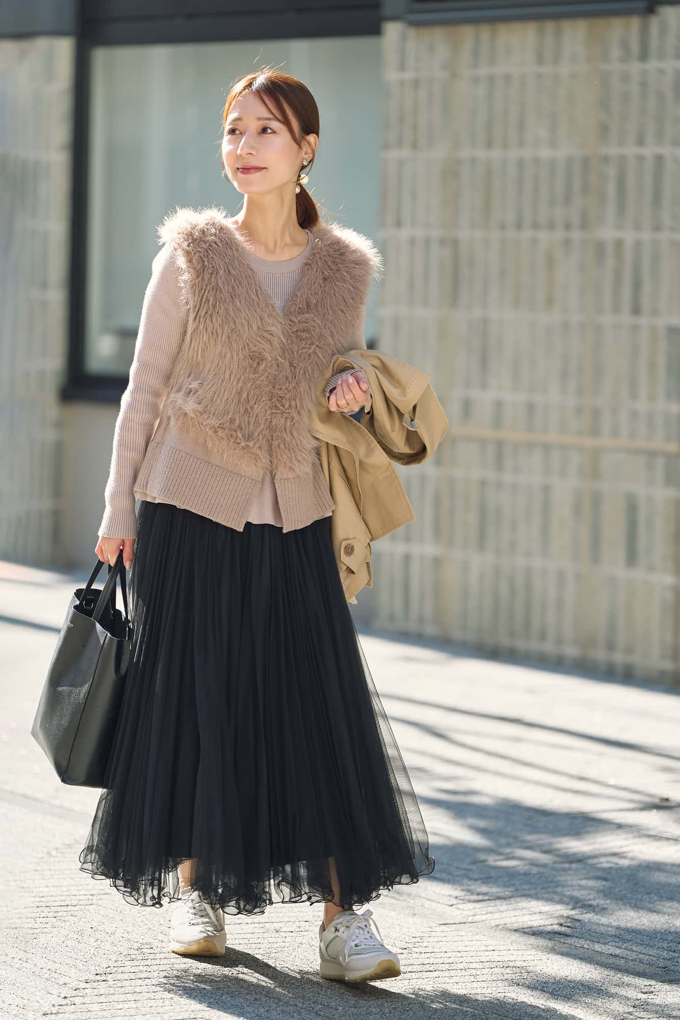 カジュアルに合わせても可愛いファーベストですが、女性らしさを出したい日はチュールスカートを合わせます。甘さが強くなり過ぎないよう、足元はスニーカーで抜け感を出し、ブラックのバッグでコーデを引き締めました。