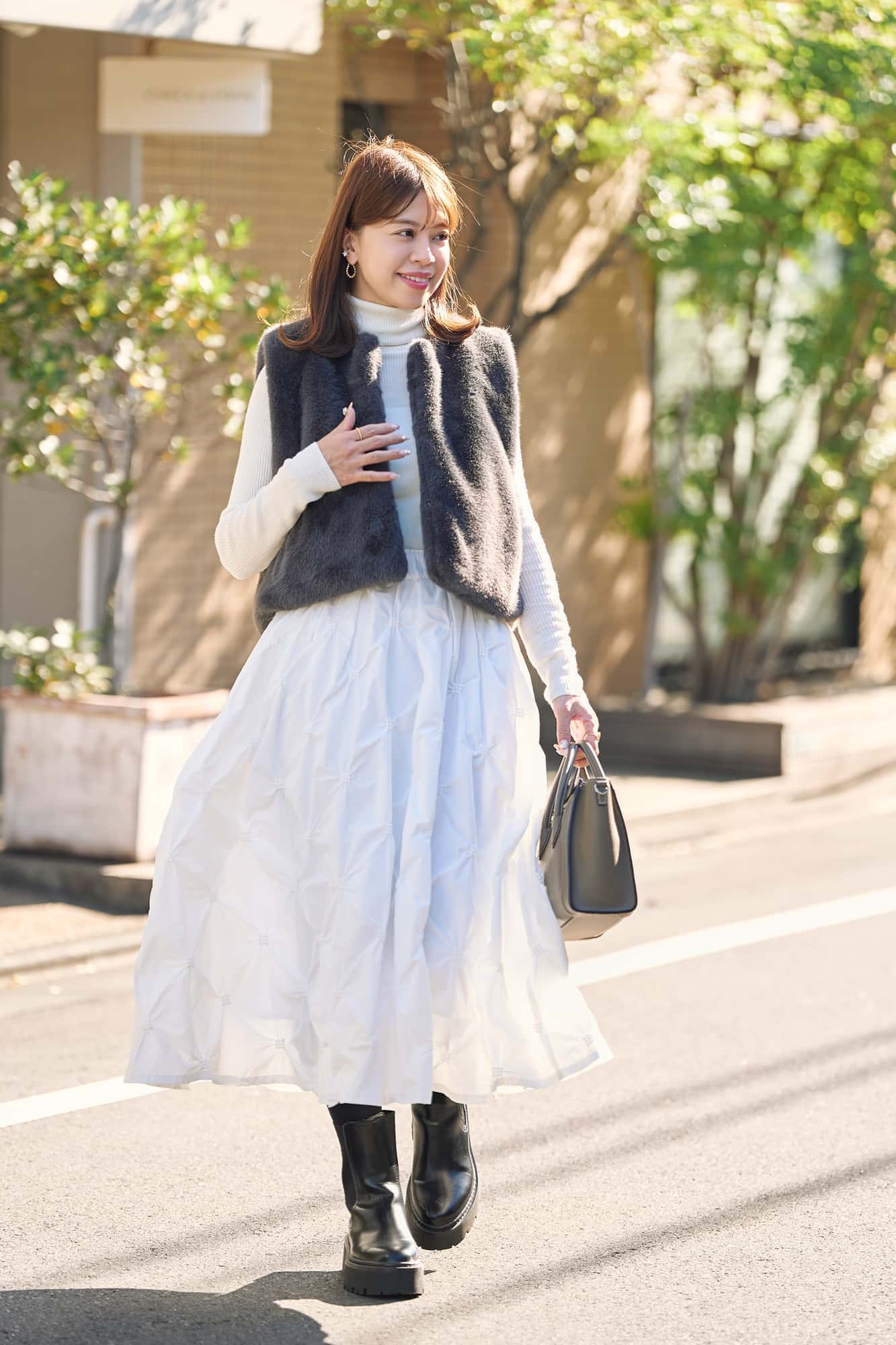 グレーのボリュームのあるファーベストが主役になるよう、トップスとボトムスは白でまとめました。可愛いフレアスカートにはベストは開けて着用し抜け感を出したり、カジュアルなブーツを合わせたりと、甘くなりすぎないようにバランスを取っています。ファーベストは手触りが良く暖かいので、寒い冬にぴったりのアイテムです。