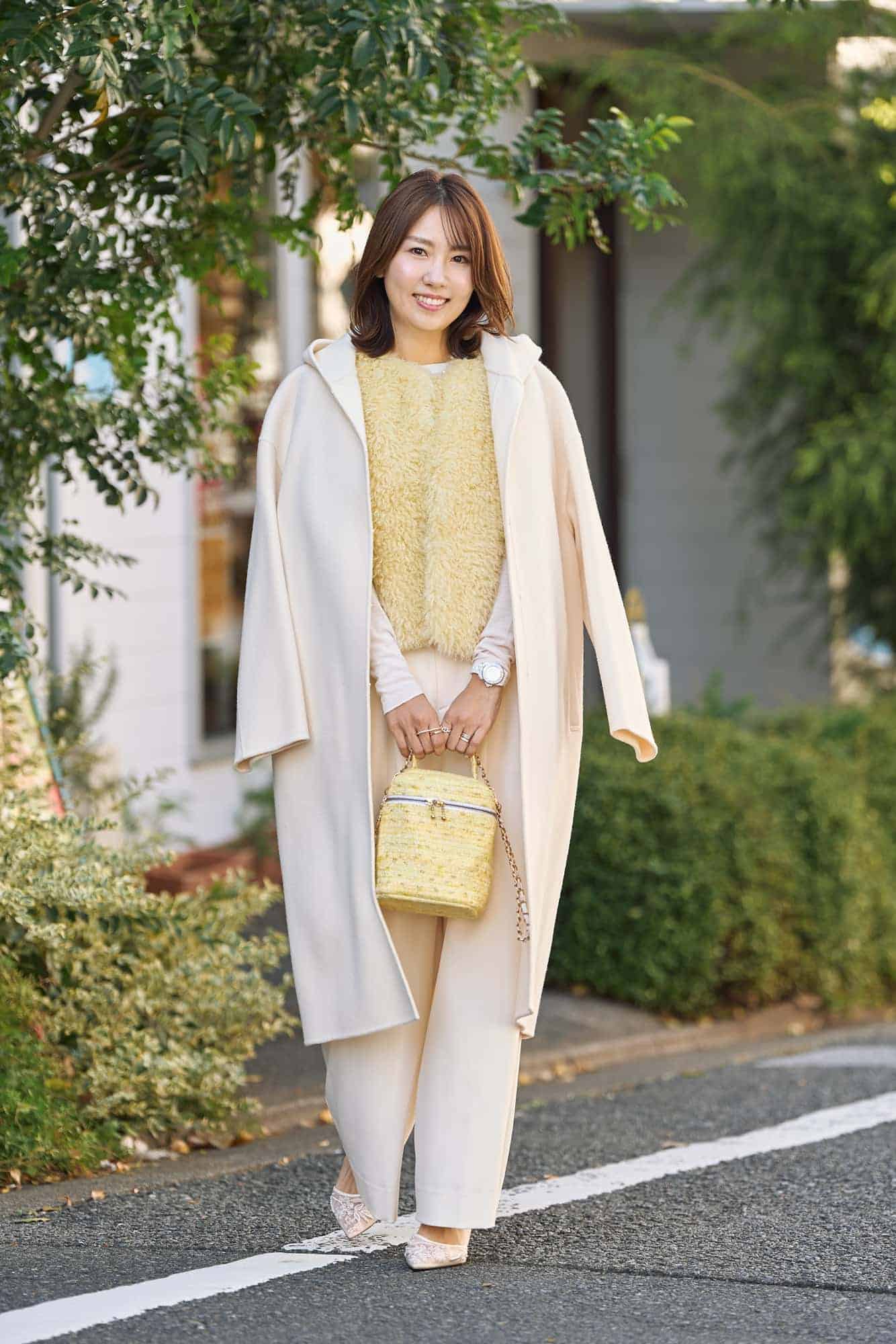 冬は暗い色の洋服が多くなりがちなので、気分が明るくなるようなイエローのジレとツイードのバニティバッグを主役にコーデを組みました。季節感に囚われすぎず、自分が好きな色、自分に似合う色をいつも楽しみたいと思っています。オフホワイトとたまごイエローの可愛い色味の組み合わせなので、ワイドパンツとオーバーサイズのコートをパサっと羽織り、落ち着いた大人っぽい要素も加えています。