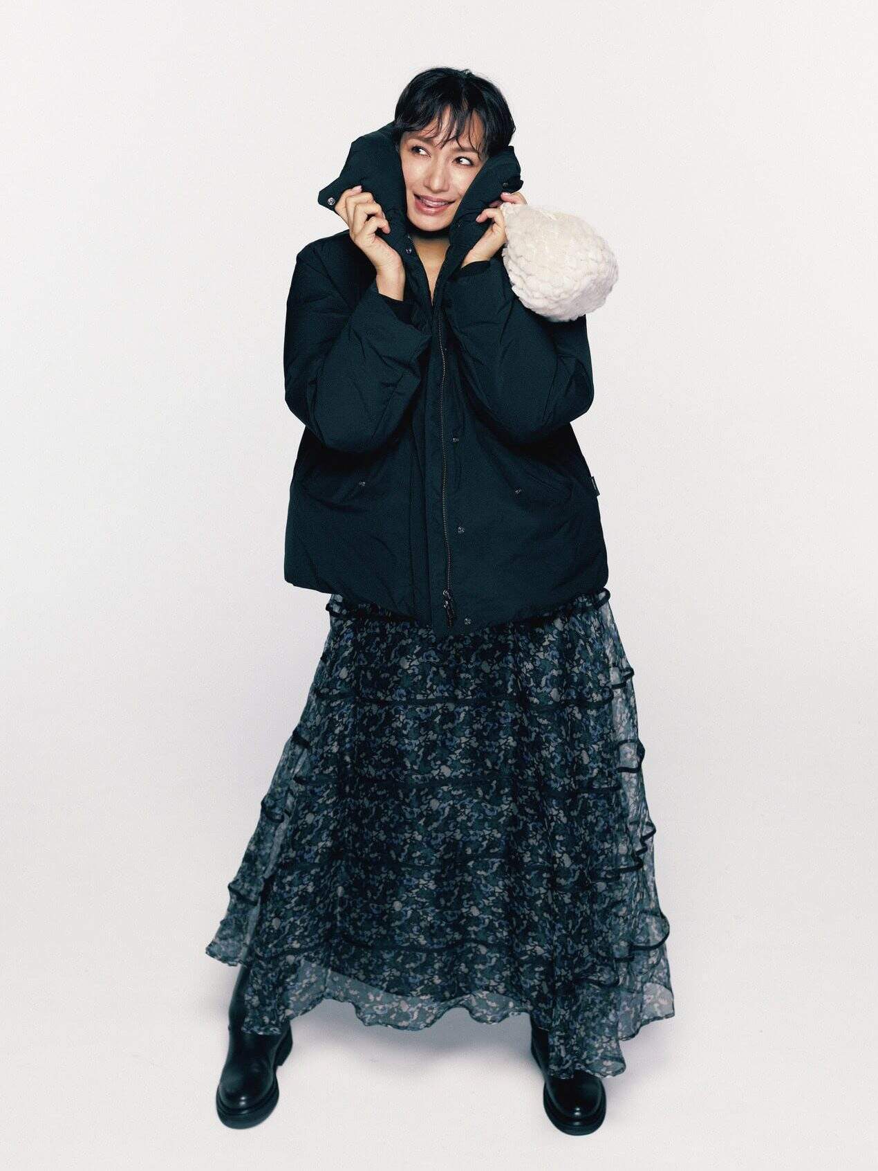 ダウンコート¥132,000(オブリオ)ブラウス¥39,600(エブール/リトルリーグ インク)スカート¥34,100(アルディー ノアール/スピック&スパン ルミネ有楽町店)バッグ¥86,900(マリア ラ ローザ/ロンハーマン)ブーツ¥89,100(パープレッド)ピアス¥143,000(ソフィー ブハイ/エスケーパーズ アナザーワールド)