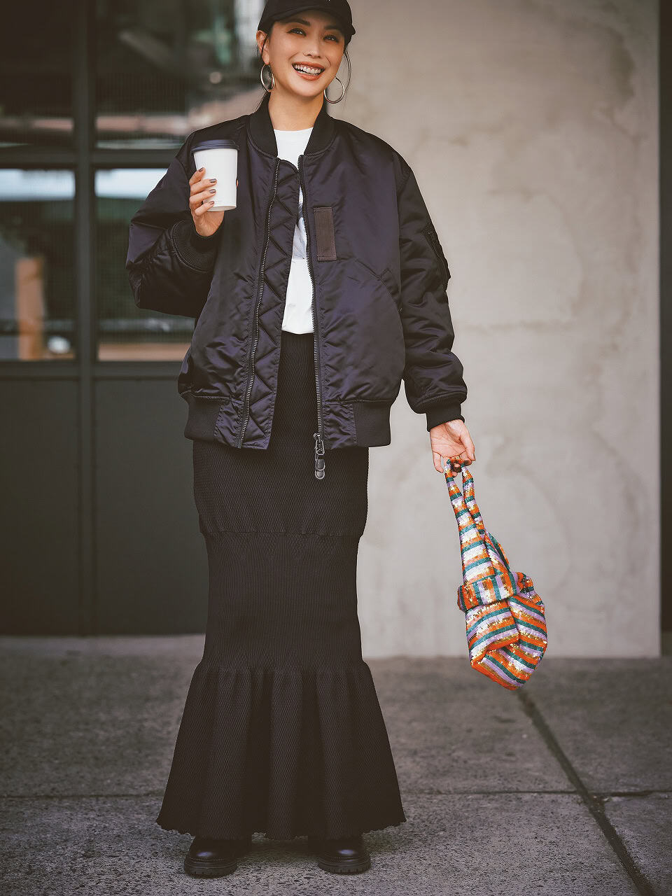 動きやすいブルゾンは、黒を選べば一気に大人顔に。ニットタイトの柔らかな質感のスカートと合わせて、ラクなのに女性らしいバランスを実現します。アクティブな日に品を添えてくれるコーデに。