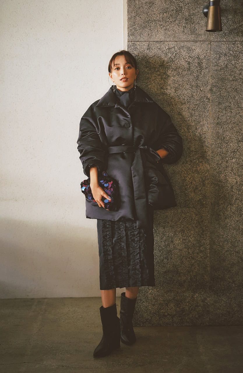 光沢を抑えた黒ダウンならディナーシーンにも自然にフィット。ウエストマークの立体感が、コーデに甘ニッシュな雰囲気をプラスします。カジュアル見えを回避しつつも華やぐ一着。