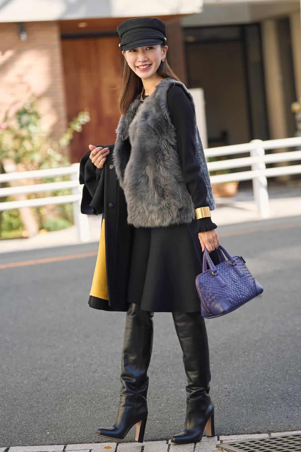 KARL DONOGHUEのムートンレザーが好きで、愛用しているストールに続きベストも買い足しました。カジュアルにもきれいめにも使える万能アイテムです。今回はパープルのバッグをポイントに、Aラインスカートとキャスケットで可愛らしいテイストもプラス。また、ニーハイブーツでバランスを取り、甘さの中にもスタイリッシュさを添えました。