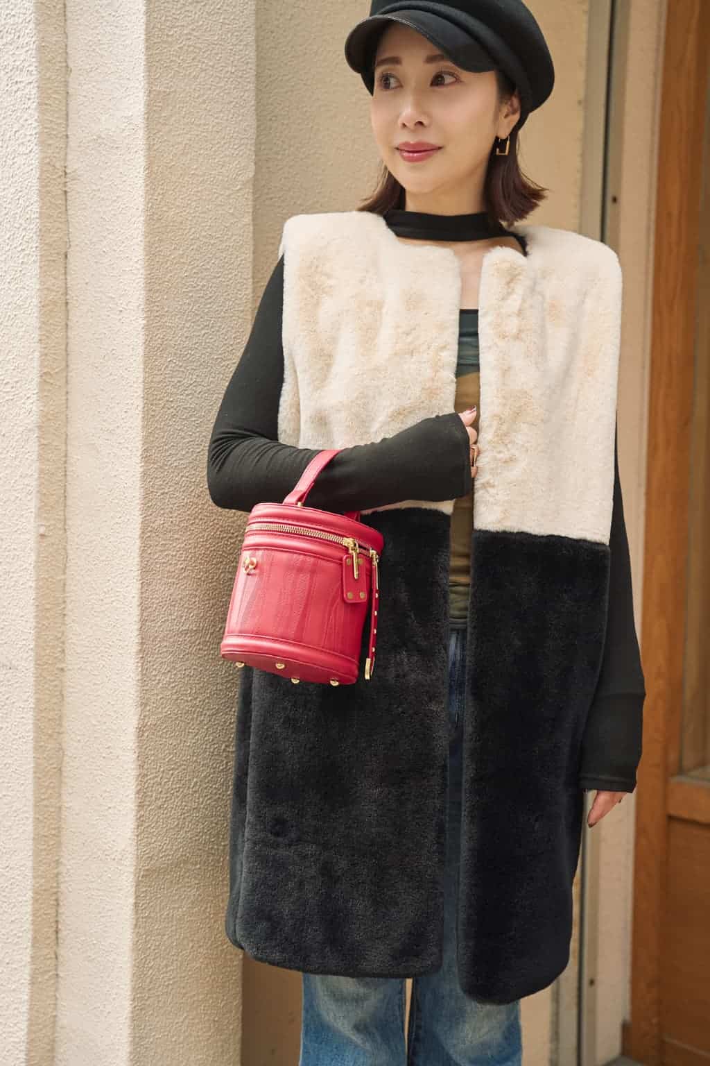 韓国で出会ったバイカラーのファージレは、ふっくらとした厚みで真冬でも頼れるあたたかさ。顔まわりが白なので着るだけでパッと表情が明るくなり、コーデも映えます。今回は赤のバッグを差し色に、デニムと合わせて抜け感をプラス。きれいめになり過ぎず、日常に取り入れやすい大人カジュアルを楽しんでいます。