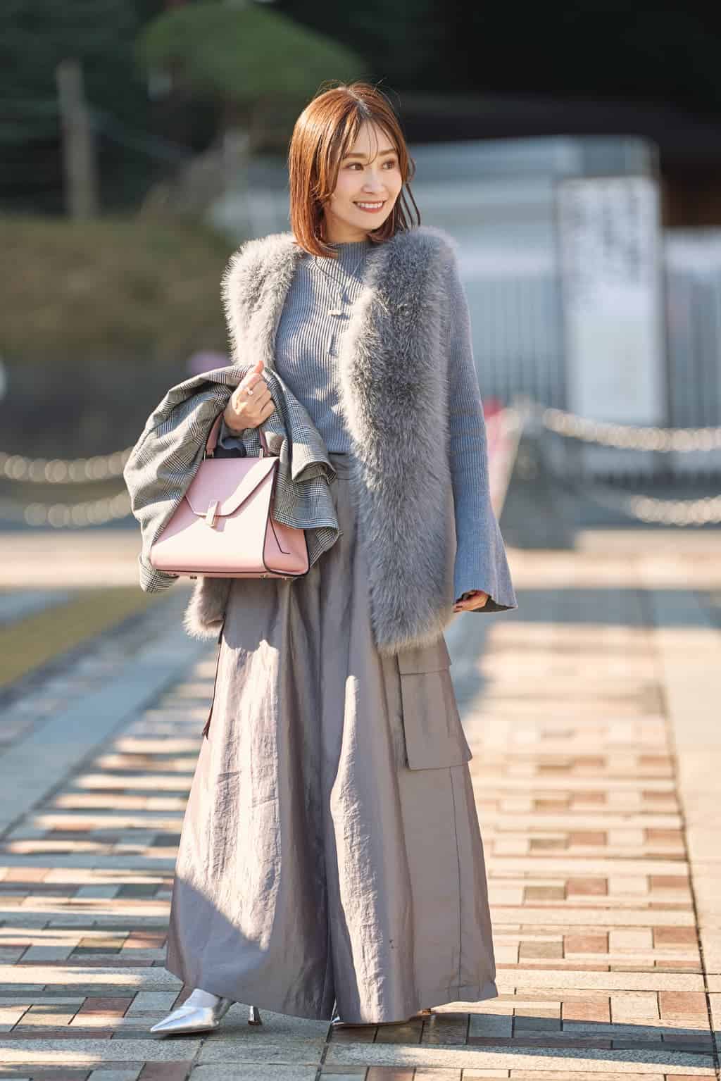全体はグレーのワントーンでまとめていますが、ファーのボリューム感や光沢パンツのおかげで、のっぺりせず立体感のある仕上がりに。ファーベストは上品さもあって、しかもあったかいので秋冬はついつい手が伸びます。ピンクのバッグで可愛さをプラスしたのもポイント! グレーコーデの中にほんのり甘さが入って、気分も上がります♡