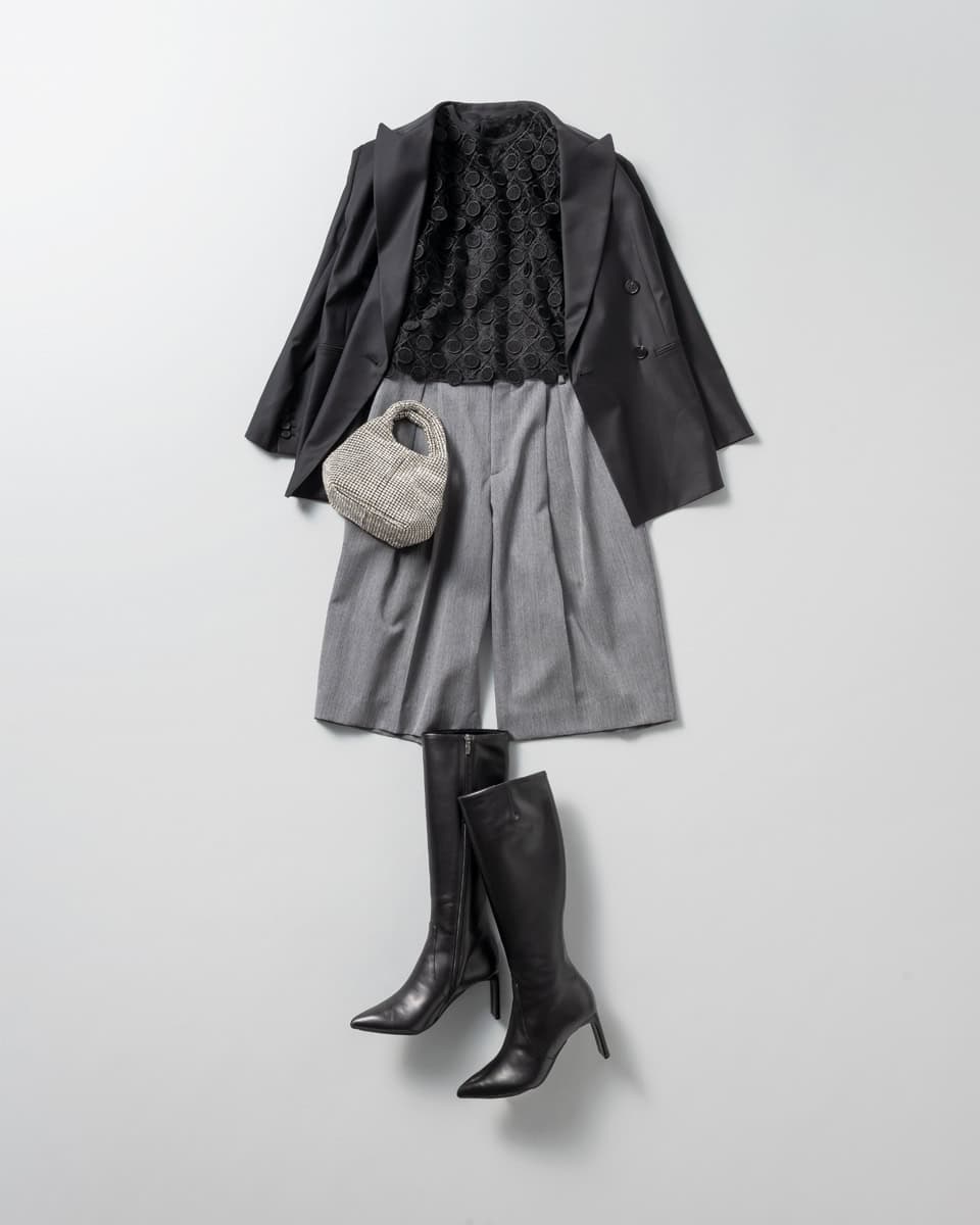 年明けすぐの女子ランチはおしゃれ欲が高まり、いつも以上に華やかな盛りコーデを目指しがち。そこでより大人の洗練度を高めるなら、むしろ甘さを極力抑えたほぼクロな甘ニッシュ(甘い+マニッシュ)が気分!敢えてカラーレスでレースのブラウスやハーフパンツなどトレンド感もプラスしたシックなモノトーンコーデで鮮度UPを狙って。