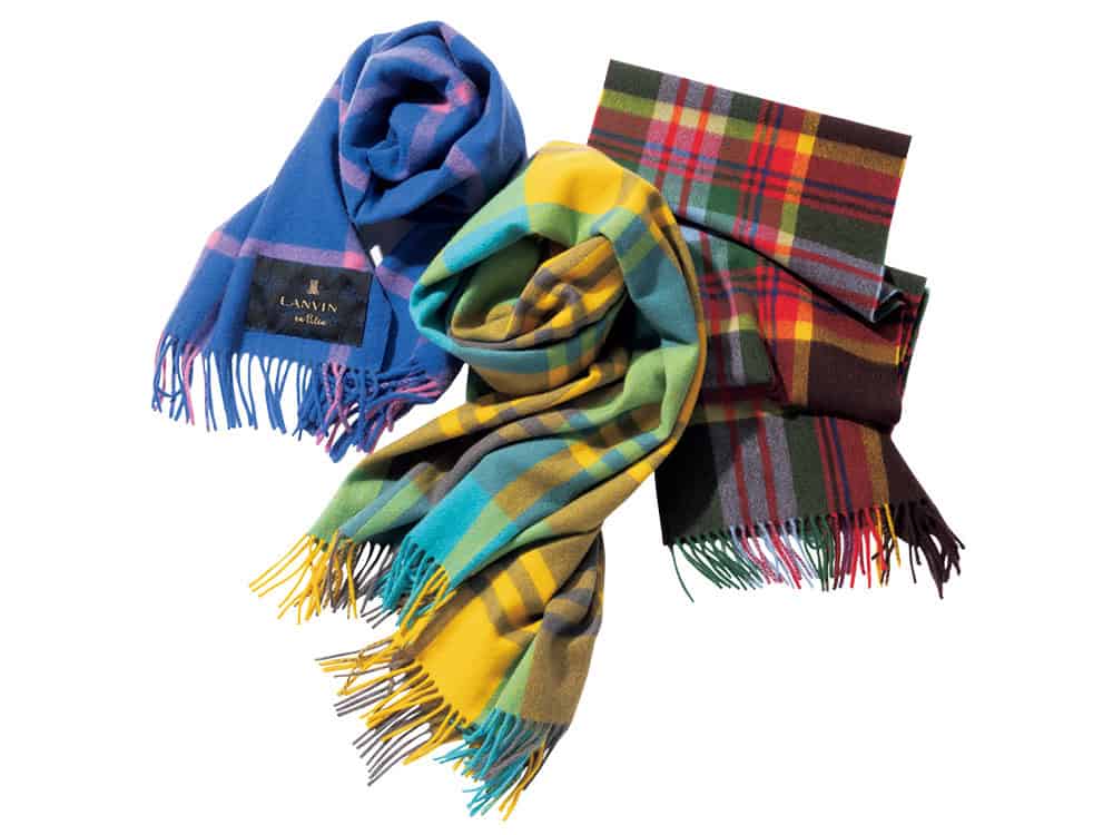 マフラー青¥8,800(ランバン オン ブルー/オーロラ)マフラー黄¥93,500マフラー赤¥39,600(ともにジョシュアエリス/真下商事
